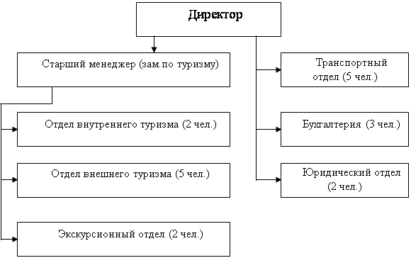 Для того, щоб успішно функціонувати в довгостроковій перспективі, організація повинна уміти передбачати, які труднощі можуть виникнути на її шляху в майбутньому, і те, які нові можливості можуть відкритися для неї. Матриця SWOT-анализу діяльності ТОВ «ЛАРОС» допомогла встановити зв'язку між силою і слабкістю, які властиві організації, зовнішніми погрозами і можливостями. На основі порівняльного аналізу основних конкурентів ТОВ «ЛАРОС» і SWOT-анализу її діяльності можна виділити найбільш істотні проблеми турфирмы: зміна смаків споживачів; падіння об'єму реалізації послуг за рахунок чинника сезонності; посилювання конкуренції. На підставі виявлених проблем керівництво ТОВ «ЛАРОС» виробило і сформулювало корпоративну стратегію: підвищення ефективності діяльності підприємства за рахунок вдосконалення асортименту пропонованих послуг. Таким чином, під плануванням діяльності туристського підприємства слід розуміти систематичний, інформаційно-оброблюваний процес якісного, кількісного і тимчасового визначення майбутніх цілей, засобів і методів формування, управління і розвитку підприємства. Місія ТОВ «ЛАРОС» - допомогти людям подивитися світ, обов'язково підібрати прийнятний варіант для будь-якого туриста, змінити думку середнього класу, про те, що закордон не доступна за ціною, шляхом професійних консультацій та приємних знижок. Залучити клієнтів за допомогою індивідуального підходу, професіоналізму і захоплюючою атмосфери. Турфірма, яка ігнорує інтереси своїх клієнтів, і не має стратегії на майбутнє, ризикує втратити своє місце на туристичному ринку. Щоб створити конкурентоспроможне підприємство, треба не просто модернізувати виробництво і управління, а й чітко знати, для чого це робиться, яка мета повинна бути досягнута. Причому головним має бути вміння визначити, а потім швидко і ефективно використовувати в конкурентній боротьбі свої переваги. Всі зусилля підприємства повинні бути спрямовані на розвиток тих якостей, які вигідно відрізняють його від потенційних або реальних конкурентів. Цілі: Фірма передбачає займатися організацією подорожей для іноземних громадян. До стратегічно важливим рішенням для туристичної фірми «ЛАРОС» відносяться наступні види рішень: • Рішення про вихід на нові сегменти ринку. • Стабільне зростання компанії. • Рішення про відкриття декількох офісів. • Надання якісних послуг. • Передбачається також використовувати допоміжних робітників поза штатом, а саме: для поширення рекламних буклетів і брошур. • Фірма повинна прагнути до стабільного становища на ринку за рахунок виявлення та просування конкурентних переваг Для успішного досягнення стратегічних цілей фірма повинна орієнтуватися на: • Володіння висококваліфікованими, мотивованими і лояльними керівниками і персоналом (на кращих професіоналів у своїй галузі); • повноцінне інформаційне забезпечення діяльності; • Завоювання доброї репутації та іміджу у споживачів; • Домогтися ексклюзивного комісійної винагороди від операторів; • Стати агентством з найбільшим обсягом продажів серед агентств Дніпропетровська. 2.2 ОРГАНІЗУВАННЯ У турфирмі ТОВ «ЛАРОС» існує лінійно-функціональна організаційна структура. Цей вид структури найбільш прийнятний для турфирмы, оскільки вона має невеликий штат співробітників. І ця організа