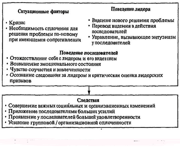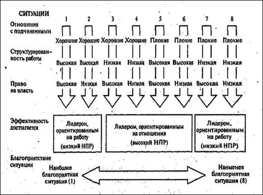 Рис. 2.3 - Континуум ситуационной модели лидерства Филлера На рис. 2.3 также показаны ситуации, в которых лидер с высоким НПР, возможно, будет более эффективен, чем лидер с низким НПР. Лидер с высоким НПР добивается лучших результатов в условиях умеренной благоприятности (ситуации 4-6). Ситуации 3 и 4 представляют собой случаи, когда последователи выполняют слабо структурированное задание, но в то же время имеют наилучшие отношения с лидером. Соответственно лидер в этих условиях вынужден проявлять интерес к эмоциям подчиненных. Возможна и другая ситуация, когда лидер обожаем, но задание слабо структурировано. В этом случае лидер зависит от наличия у последователей желания и творческой инициативы для выполнения поставленной задачи. Поэтому ему необходимо перевести внимание с отношений на работу как таковую. В модели Фидлера имеется рад неясных моментов. Первый относится к уровню точности и полноты измерения лидерского стиля с помощью показателя НПР, предполагающего делать это в одномерном пространстве. Вызывает сомнение утверждение Фидлера об относительном постоянстве величины НПР во времени, о его слабой подверженности изменениям. Модель также не предлагает вести поиск эффективности для лидера сразу по двум направлениям: отношения и работа. Однако, несмотря на эти замечания, модель широко используется в решении проблем лидерства в организациях. Одной из наиболее современных в объяснении ситуационного лидерства является модель, предложенная Виктором Врумом и Филиппом Йеттоном [4, c.468], которая позже была существенно дополнена с участием Артура Яго. Модели «путь - цель» данная модель предлагает определять эффективный лидерский стиль в зависимости от ситуации. Предполагается также, что один и тот же лидер может использовать различные стили. Основным отличием модели является ее ориентированность только на один аспект лидерского поведения - привлечение подчиненных к участию в принятии решений. Соответственно лидеру предлагается концентрировать внимание на проблеме, которая должна быть решена, и на ситуации, в которой проблема возникла. Главной идеей модели является то, что степень или уровень привлечения подчиненных к участию в принятии решения зависит от характеристик ситуации. В соответствии с моделью не существует одного единственно верного способа принятия решения, пригодного для всех ситуаций. После анализа и оценки каждого аспекта проблемы лидер определяет, какой стиль, с точки зрения участия подчиненных в принятии решения, ему лучше использовать. Одной из отличительных особенностей модели является то, что в целом она делает больший упор на изучение ситуации, чем на изучение личности лидера. Действительно, может быть, имеет больше смысла говорить об автократической ситуации и ситуации участия, чем об автократическом лидере или участвующем лидере. Итак, модель дает основания для утверждения того, что руководителя, несмотря на то, что это очень трудно, можно обучить тому, как стать эффективным лидером. Это намного труднее, чем изменить ситуацию, в которой находится лидер. Однако, через обучение и опыт все-таки можно улучшить способности лидера использовать власть и влияние в условиях наилучшего благоприятствования. Это означает, что программа обучения может быть полезной лидеру, ориентированному на отношени