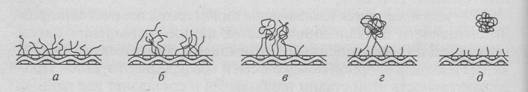 Рис. 1. Этапы образования пиллей: а — появление мшистости поверхности; б — группировка и перепутывание волокон; в — образование рыхлых комочков; г — уплотнение пиллей; д — отрыв пиллей. Если пилли образуются быстро, но затем легко удаляются с поверхности материала, то внешний вид изделий от пиллинга, можно считать, практически не ухудшается. Но когда в смеси используются синтетические волокна, обладающие высокой стойкостью к многократным деформациям, третья из перечисленных выше стадий становится длительной, а в отдельных случаях постоянной (удаление отдельных пиллей компенсируется образованием новых). В этом случае имеем устойчивый пиллинг. Пиллингуемость тканей зависит от волокнистого состава материала, геометрических и механических свойств волокон, структуры нитей и ткани. Наиболее устойчивой пиллингуемостью обладают ткани, при выработке которых в смеси используют полиамидные (капрон) или полиэфирные (лавсан) волокна. Эти волокна обычно имеют гладкую поверхность, большие удлинение и прочность, высокую стойкость к многократным деформациям. Благодаря указанным свойствам волокна быстро выходят на поверхность ткани, что ведет к формированию пиллей и очень длительному удержанию их на поверхности ткани. Напротив, волокна с незначительной прочностью и низкой стойкостью к многократным деформациям (например, акрилонитриловыс —нитрон) дают, как правило, слабый пиллинг. Толщина и форма поперечного сечения волокон оказывают существенное влияние на пиллингуемость. Более тонкие и гладкие волокна имеют большую склонность к образованию пиллинга по сравнению с толстыми с неровной поверхностью. И здесь в конечном счете сказывается различная способность волокон к выходу на поверхность ткани и перепутыванию (более жесткие волокна имеют меньшую склонность к перепутыванию). Для снижения пиллингуемости выпускают профилированные синтетические волокна, которые имеют поперечное сечение в виде прямоугольника, треугольника, звездочки и т. п. Пиллингуемость снижается при увеличении длины волокон, из которых изготовлена ткань. Структура пряжи и ткани с целью уменьшения пиллингуемости должна обеспечивать прочное и надежное закрепление волокон. Поэтому при увеличении крутки, уменьшении длины перекрытий и увеличении показателей заполнения пиллингуемость тканей понижается. Наконец, снижение пиллингуемости или полное ее исключение может быть достигнуто в результате специальных обработок тканей (к примеру", термофиксации тканей из синтетических волокон). 3. Проведение испытания Настоящий стандарт распространяется на готовые ткани, вырабатываемые по основе из натурального шелка, химических нитей, шелковой пряжи и пряжи из синтетических волокон, в том числе смешанной, а по утку - из всех видов текстильных нитей и пряжи и устанавливает метод определения пиллингуемости. Стандарт не распространяется на ворсовые ткани и ткани технического назначения. Методы определения пиллингуемости основаны на имитации легких истирающих воздействий поверхности ткани, приводящих к образованию мшистости и формированию пиллей, а затем на подсчете максимального количества пиллей на определенной площади испытуемого образца. Пиллингуемость шелковых и полушелковых тканей из пряжи и химических нитей, а также смешанных хлопчатобумажных тканей 