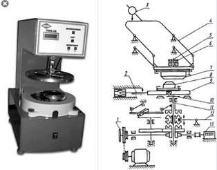 Рисунок 1 Пробные кружки заправляют лицевой стороной вверх в нижний держатель, а абразивный круг в верхний держатель. Нижний держатель укреплен на столике, который может быть переключен па один из двух видов движения: качательное и круговое. Верхний держатель находится под нагрузкой, что обеспечивает требуемое давление абразива на пробу. Нагрузку выбирают в зависимости от жесткости ткани, которая определяется на специальном приспособлении, используемом для заправки пробных кружков в нижний держатель. Испытания проводят в два этапа: первый предполагает образование ворсистости, второй - формирование пиллей. 3.1 Образование ворсистости Ворсистость образуется при следующих параметрах работы : -радиус окружности движения нижнего держателя 50 мм; -движение нижнего держателя - качательное; -нагрузка верхнего держателя на нижний 500 гс; -удельное давление на испытуемую часть ткани 50 гc/см2; -число циклов 300. После - 300 циклов качания нижнего держателя пробные кружки перезаправляют таким образом, чтобы каждая последующая проба подвергалась трению по новому месту абразива. 3.2 Образование пиллей Пилли образуются при следующих параметрах работы прибора: -радиус окружности движения нижнего держателя 3 мм; -движение нижнего держателя — по окружности в одном направлении; -нагрузка верхнего держателя на нижний 100 гс; -удельное давление на испытуемую часть ткани 100 гс/см2. После 100, 300, 600, 1000, 1500 и 2000 циклов и далее через каждые 500 циклов прибор останавливают, поднимают верхний держатель и на нижнем держателе на ткани (на площади 10 см2) с помощью лупы и препарировальной иглы подсчитывают число пиллей. При этом ткань освещают пучком света, косо направленным от осветителя. Испытания проводят до тех пор, пока число пиллей не начнет уменьшаться или не будет оставаться неизменным. Если на одной элементарной пробе ткани после 1000 циклов пиллингования пили не образуются, испытание прекращают и элементарную пробу ткани считают непиллингующейся. Если пили не образуются подряд на трех элементарных пробах ткани, то последующие две элементарные пробы не испытывают и точечную пробу ткани считают непиллингующейся. 4. Обработка результатов По каждому заданному числу циклов пиллингования находят среднее арифметическое число пиллей для элементарных проб с точностью до 0,1 и проставляют его в колонку средних результатов на строку заданного числа циклов (см. приложение). Если испытание одной из элементарных проб будет закончено на большом количестве циклов, чем испытание остальных элементарных проб, то этот результат записывают в колонку средних результатов в строку заданного числа циклов. За окончательный результат пиллингуемости ткани принемают максимальный показатель количества пиллей из средних результатов испытаний, округленной до единицы. Выводы пиллингуемость ткань волокно ворсистость Тема изученного мной вопроса безусловна важна для меня, как для будущего специалиста по управлению качеством. Благодаря проделанной работе я изучила понятие пиллингуемость, методики её определения, освоила принцип действия пиллингметра. Заканчивая курсовую работу, хотелось бы отметить, что в настоящее время большое внимание уделяется качеству продукции. Проектирование пиллингуемости и на стадии разработки полотна позволит технологу учитывать эксплуатацион