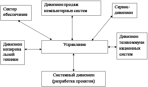 Рисунок 3 – Организационная структура управления «Trade Master» Управление фирмы состоит из генерального директора, заместителя генерального директора и бухгалтера. Основным управленческим органом, принимающим решения, является совет акционеров, который собирается в конце года или по мере необходимости. В остальное время управленческие обязанности выполняют генеральный директор и его заместитель. Сектор обеспечения составляют юрист, заведующий складом и секретарь-референт. Они обеспечивают нормальную работу фирмы во внешней среде. Дивизион продаж компьютерных систем занимается продажей самих компьютеров и компьютерной периферии. Часто бывает так, что клиент закупает компьютеры у одной фирмы, а монтировать сеть нанимает другую фирму. Поэтому наряду с системным дивизионом был создан дивизион продаж компьютерных систем. В него входит руководитель дивизиона и менеджер по продажам. Дивизион продаж копировальной техники аналогичен предыдущему дивизиону и занимается продажей копировальной и множительной техники. Дивизион телекоммуникационных систем непосредственно создает корпоративные компьютерные сети, осуществляет прокладку и монтаж кабельных систем, устанавливает телефонные и видеокоммуникации, включая Internet. Системный дивизион разрабатывает проекты современных информационных систем, коммуникативных систем, локальных и корпоративных телефонных сетей. Сервис-дивизион предоставляет услуги по обслуживанию всего проданного оборудования и установленных фирмой разного рода сетей. Данный дивизион представлен руководителем дивизиона, инженером по ремонту копировальных аппаратов, инженером по проектированию и монтажу кабельных систем и инженером по ремонту компьютерных систем. Как было сказано выше, фирма ориентируется на корпоративного заказчика, однако в последнее время клиентами компании становятся не только крупные предприятия, но и предприятия малого бизнеса и даже частные лица. Такую тенденцию руководители фирмы связывают с тем, что покупатели техники начинают понимать, что лучше купить дорогую, но качественную технику, чем приобрести дешевую и потратить в несколько раз больше средств и времени на ее ремонт. Но даже если компьютер по каким-либо причинам выйдет из строя, покупателю не надо думать, куда отнести свою технику чтобы ее качественно отремонтировали, мастер сам придет в кратчайшие сроки. Благодаря надежности техники и высокому качеству обслуживания среди заказчиков фирмы «Trade Master»: ¾ Администрация Краснодарского края, ¾ ГТРК «Кубань», ¾ УВД Края, ¾ Кубаньбанк, ¾ Югбанк, ¾ Инкомбанк, ¾ СП «Тетра Пак», ¾ АО «Газстрой» и многие другие. 2.2 Анализ технико-экономических показателей деятельности предприятия Основные технико-экономические показатели, характеризующие деятельность предприятия за 1999-2001 гг. приведены в таблице 1. Таблица 1 – Основные технико-экономические показатели предприятия