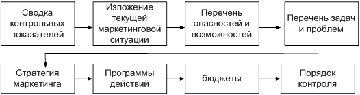 Сводка контрольных показателей. В самом начале плана должна идти краткая сводка основных целей и рекомендаций, о которой пойдет речь в плане. Сводка контрольных показателей помогает высшему руководству быстро понять основную направленность плана. За сводкой следует поместить оглавление плана. Текущая маркетинговая ситуация. В первом основном разделе плана дается описание характера целевого рынка и положения фирмы на этом рынке. Составитель плана описывает рынок с точки зрения его величины, основных сегментов, нужд заказчиков и специфических факторов среды, делает обзор основных товаров, перечисляет конкурентов и указывает канал распределения. Опасности и возможности. Этот раздел заставляет руководителей взглянуть на перспективу и представить опасности и возможности, которые могут возникнуть перед товаром. Цель всего этого - заставить руководство предвидеть важные события, которые могут сильно сказаться на фирме. Управляющие должны перечислить максимально возможное число опасностей и возможностей, которые они могут себе представить. Опасность - осложнение, возникающее в связи с неблагоприятной тенденцией или конкретным событием, которое - при отсутствии целенаправленных маркетинговых усилий - может привести к подрыву живучести товара или его гибели. Маркетинговая возможность - привлекательное направление маркетинговых усилий, на котором конкретная фирма может добиться конкурентного преимущества. Управляющий должен оценить вероятность возникновения каждой опасности и каждой возможности и их последствия для фирмы. Задачи и проблемы. Изучив связанные с товаром опасности и возможности, управляющий в состоянии поставить задачи и очертить круг возникающих при этом проблем. Задачи должны быть сформулированы в виде целей, которых фирма стремится достичь за период действия плана. Стратегия маркетинга. В этом разделе плана управляющий излагает широкий маркетинговый подход к решению поставленных задач. Стратегия маркетинга - рациональное, логическое построение, руководствуясь которым организационная единица рассчитывает решить свои маркетинговые задачи. Она включает в себя конкретные стратегии по целевым рынкам, комплексу маркетинга и уровню затрат на маркетинг. Программа действий. Стратегии маркетинга необходимо превратить в конкретные программы действий, дающие ответы на следующие вопросы: 1) что будет сделано? 2) когда это будет сделано? 3) кто это будет делать? 4) сколько это будет стоить? Бюджеты. План мероприятий позволяет управляющему разработать соответствующий бюджет, являющийся, по сути дела, прогнозом прибылей и убытков. В графе "Поступления" дается прогноз относительно числа и средней цены-нетто товарных единиц, которые будут проданы. В графе "Расходы" указываются издержки производства, товародвижения и маркетинга. Их разность дает сумму ожидаемой прибыли. Высшее руководство рассматривает предлагаемый бюджет и утверждает или изменяет его. Будучи утвержденным, бюджет служит основой для закупки материалов, разработки графиков производства, планирования потребностей в рабочей силе и проведения маркетинговых мероприятий. Порядок контроля. В последнем разделе плана излагается порядок контроля за ходом выполнения всего намеченного. Обычно цели и бюджетные ассигнования расписывают по месяцам