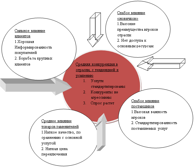 Шкала оценок: 0 – не влияет 1 – слабо влияет 2 – сильно влияет 1. Влияние со стороны новых конкурентов. Рынок ивент-услуг относительно молодой бизнес в России. Первые ивент-агентства стали открываться в крупных городах в 1999 году. Сейчас точно сказать, сколько агентств работает на рынке очень сложно, так как рынок не прозрачен. Барьер для входа в отрасль не высокий, возможность появления новых игроков велика. Величина требуемого капитала для входа на рынок отрасли не высока. Эффективный масштаб оказания услуг может быть достигнут достаточно быстро. Фирмы в отрасли не склонны применять агрессивные стратегии против "новичков" и не координируют свою деятельность в рамках отрасли для отражения экспансии. Но, при этом, появление достаточно весомых игроков практически отсутствует. Рынок ивент-услуг был и будет «личностным». Наличие у агентств заказов с высоким бюджетом в основном определяют связи и узнаваемость агентства, так же большое влияние оказывают отзывы клиентов. Зачастую, чтобы выжить, новое агентство принимается за самые низкобюджетные мероприятия. Провести хорошо такое мероприятие бывает очень сложно, так как артисты, выступающие за маленькие гонорары, всегда имеют низкую квалификацию. Получается что, стать аутсайдером рынка рискует каждое второе, вновь открывшееся, агентство праздников. Поэтому 70% рынка ивент-услуг поделили между собой 30 крупных компаний. Соответственно, влияние новых игроков оказывает минимальное влияние на основных игроков рынка. 2. Влияние поставщиков и партнеров. В большинстве своем, ивент-агентства являются «перекупщиками» услуг. Работая с заказами, ивент-менеджер ищет по базам подходящих артистов для события, тем самым подстраивая артиста под заказ. Следовательно, если артист не соглашается на условия ивент-менеджера, менеджер ищет другого артиста, того же жанра и категории. Поэтому на нашем рынке очень четко прослеживается закономерность: чем лучше и известнее агентство, тем влияние на него со стороны партнеров минимально, или, наоборот, чем агентство меньше, тем чаще ему приходится подстраиваться под артиста. Исключением бывает только, когда артист эксклюзивен или широко известен. В данной курсовой работе будут исследованы крупные игроки рынка, влияние партнеров и поставщиков услуг на них минимально. 3. Влияние потребителей. По динамике роста рынка event-услуг можно сделать вывод, что интерес к проведению мероприятий увеличился со стороны рыка B2B, так же активизировались и частные потребители, которые хотят организовать праздник. Очень большое влияние на выбор агентства оказывает информированность клиентов. Крупные компании обратятся только в зарекомендовавшее себя агентство, так же как и обеспеченные клиенты. Личность ивент-менеджера имеет большое значение при выборе организатора праздника. Люди со средним достатком будут искать организатора по соотношению цена-качество, люди с низким достатком в редких случаях прибегают к услугам организаторов праздника. Поэтому можно сделать вывод, что влияние потребителей на рынок очень велико. Именно потребители имеет мнение и от этого мнения зависит, будут ли у агентства заказ на проведение тех или иных мероприятий. 4. Влияние товаров-субститутов. Заменителем услуги, оказываемой моей компанией, является отказ от данной услуги. То есть потен
