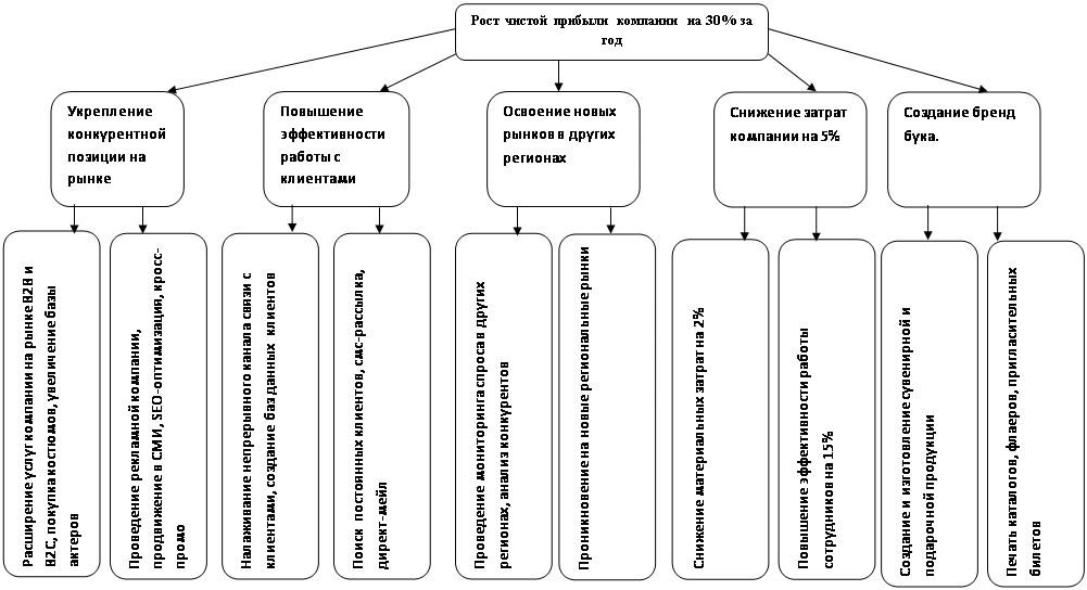 Данное дерево целей составлено по результатам аналитической части. Цели достижимы, корректны, соответствуют выбранной стратегии компании. При достижении подцелей в поставленные сроки, нашей компании по результатам 2011 года удастся увеличить чистую прибыль на 30%, увеличить долю рынка. 3. ПРАКТИЧЕСКАЯ ЧАСТЬ В данной части курсовой работы будет разработан конкретный поэтапный план достижения поставленных целей. 1. Укрепление конкурентной позиции на рынке. Одной из целей нашей компании является укрепление конкурентной позиции на рынке B2C, выход на рынок B2B. Услуги, которые мы оказываем частным клиентам: 1. Дни рождения, в том числе национальные дни рождения 2. Дед мороз на дом 3. Театрализованные подарки. 4. Выпускные и школьные программы Для улучшения качества обслуживания клиентов необходимо составить каталоги по каждому направлению с полным описанием услуги и фотографиями. Так же ежемесячно необходимы смс-рассылка и директ-мейл по существующим базам данных клиентов. При этом message не всегда должен иметь рекламный характер. Это может быть поздравление с праздником, либо с личным событием. Для увеличения числа клиентов, пользующимися театрализованными представлениями и розыгрышами необходимо составление качественной презентации, рассылка по е-мейлу. Для выхода на рынок корпоративных услуг так же необходимы презентации услуг. Услуги, оказываемые корпоративным клиентам, могут быть: 1. Событийный маркетинг 2. Театрализованные подарки 3. Винтажные подарки 4. Организация праздников и корпоративов, юбилеев компаний 5. Тимбилдинг, квесты 6. Конференции, семинары, презентации Для успешного выхода на рынок необходимо: 1. Вступление в ассоциацию организаторов мероприятий 2. Размещение в каталогах ивент-агентств 3. SEO-оптимизация 4. Яндекс-директ 5. Кросс-промо. Для качественного оказания новых услуг необходимо расширить базу актеров, организовать встречи с актерами оригинального жанра для презентации нашего агентства, как надежного и добросовестного рекламодателя. Увеличение количества костюмов необходимо для увеличения количества программ праздников и мероприятий. Отдельным направлением деятельности компании должны стать городские мероприятия. Для входа на рынок необходимо подготовить материалы для участия в городских тендерах правительства Москвы и области www.tender.mos.ru Основные затраты связанные с достижением первой подцели компании: