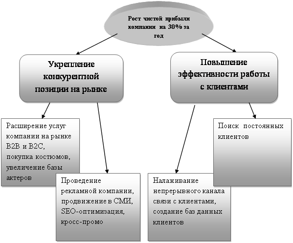 Из профиля конкурентных преимуществ можно сделать вывод, что компания имеет твердое положение на рынке, есть перспективы развития. 2.4 Анализ внутренней среды компании 2.4.1 Анализ миссии и анализ целей event-агентства Первый основополагающий шаг стратегического корпоративного управления – формулирование миссии компании. Миссия поможет мне определить, чем в действительности занимается компания, каковы ее сущность, масштабы, перспективы и направления роста, отличия от конкурентов. Миссия определяется с учетом покупательских интересов, нужд и запросов, которые удовлетворяются бизнесом. Миссия компании «Мы, группа амбициозных молодых людей, поможем Вам создать настроение. В нашем агентстве работают только профессиональные актеры театра и режиссеры праздников. Мы верим праздник – это искусство! Мы с гордостью будем нести свою миссию, опираясь на позитивную философию нашей Компании» Миссия нашей компании яркая, лаконичная, удобная для восприятия. Она хорошо передает смысл создания компании. Следующим шагом нужно определить точку, к которой будет двигаться компания, то есть поставить главную цель. Для стратегического планирования мною было построено дерево целей, которое приведено ниже: