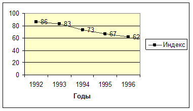 Второе - разгосударствление системы закупок и реализации продукции, продовольственной оптовой и розничной торговли. В результате резко сократились закупки сельскохозяйственной продукции государственными заготовительными организациями и потребительской кооперацией. Стали развиваться новые каналы реализации, в том числе оптовые рынки, биржи, ярмарки и др. Удельный вес централизованных закупок зерна в общем объеме его реализации уменьшился с 63% в 1993 г. до 25 в 1997 г., картофеля соответственно - с 52 до 29, овощей - с 71 до 40, мяса скота и птицы - с 79 до 45, молока и молочных продуктов - с 97 до 82, яиц - с 92 до 74%.[3] Третье - изменение системы государственного регулирования аграрного сектора: перестройка организационных структур и методов управления АПК. Начинает формироваться адекватная рынку финансово-кредитная система, включающая ценовые дотации и компенсации, денежный кредит, выделяемый на льготных условиях (не более 25% учетной ставки ЦБ), лизинг на поставку техники и оборудования, добровольное страхование сельскохозяйственной деятельности. Сельским товаропроизводителям предоставляются льготы по налогообложению. Начиная с 1994 г., складывается система защиты внутреннего рынка от импортных товаров путем установления таможенных пошлин, однако общий уровень тарифов у нас ниже, чем во многих странах с развитой экономикой. Четвертое направление реформы связано с попытками освободить сельскохозяйственные организации от функций по содержанию объектов коммунального хозяйства и социальной инфраструктуры посредством передачи последних в ведение сельских муниципалитетов, сформировать систему социальной защиты безработных и стимулировать несельскохозяйственную занятость населения. Предпринятые в ходе аграрных преобразований меры не привели к росту сельскохозяйственного производства, а, наоборот, за период 1991-1997 гг. произошло его существенное сокращение – около 40% (рис.1.1). В агропромышленном комплексе продолжаются процессы сокращения ресурсного потенциала, ухудшения финансового состояния хозяйств, а также снижение почвенного плодородия земель. За последние годы произошло сокращение доли сельского хозяйства и всего АПК в ВВП: с 1991 по 1997 г. доля сельского хозяйства в ВВП уменьшилась с 13,7 до 8,4%.[4] Индексы объема продукции сельского хозяйства (в процентах, 1990 г.=100%)