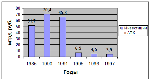 Рис.1.1 Резко сократилась государственная поддержка сельского хозяйства. Доля сельского хозяйства в расходной части бюджета по сравнению с долей сельского хозяйства в ВВП резко уменьшилась (с 1991 по 1997 г. она упала с 12 до 2,4%). Почти полностью прекращены работы по восстановлению и повышению плодородия земли. В 1997 г. против 1990 г. целевые дотации и субсидии сельскохозяйственному производству уменьшились до 33%, формирование лизингового фонда — до 37%, затраты капитального характера составили всего 8% от уровня 1996 г., а общее финансирование сельского хозяйства—71%.[5] Выбытие основных производственных фондов в 1997 г. в 5 раз опережало их ввод. За 1990-1997 гг. более чем в 17 раз сократились инвестиции в АПК. За счет всех источников финансирования в 1997 г. освоено капитальных вложений всего 6% к уровню 1991 г. (рис.1.2). На 1 га пашни внесено 12 кг минеральных удобрений, или в 9 раз меньше, чем в 1990 г., применение органических удобрений за этот период сократилось в 7 раз, фосфоритование и гипсование земли практически прекращено. Из-за недостатка техники, горючесмазочных материалов хозяйства вынуждены проводить полевые работы по упрощенным технологиям. В 1997 г. посевная площадь сократилась на 3,1 млн. га, вспахано зяби под урожай 1998 г. на 5 млн. га меньше. Производство скота и птицы за 1997 год уменьшилось на 10%, молока - на 5, шерсти - на 22%. В целом 1997 г. был благоприятным по погодным условиям, что позволило собрать 88,5 млн. т. зерна, против 69 млн. в 1996 г.