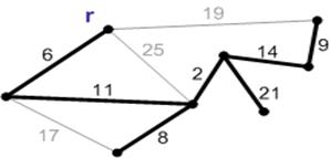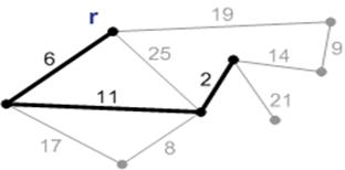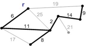 лежит в К. Тогда ребро минимального веса из E(K) будет безопасным. В связи с приведенной теоремой введем следующее Определение. Безопасным ребром e относительно некоторой компоненты связности К из А назовем ребро с минимальным весом, ровно один конец которого лежит в К. 3. Алгоритм ПримаКак и алгоритм Краскала, алгоритм Прима следует общей схеме алгоритма построения минимального остовного дерева: на каждом шаге мы добавляем к строящемуся остову безопасное ребро. Алгоритм Прима относится к группе алгоритмов наращивания минимального остова: на каждом шаге существует не более одной нетривиальной (не состоящей из одной вершины) компоненты связности, и каждый к ней добавляется ребро наименьшего веса, соединяющее вершины компоненты с остальными вершинами. По теореме такое ребро является безопасным. При реализации надо уметь на каждом шаге быстро выбирать безопасное ребро. Для этого удобно воспользоваться очередью с приоритетами (кучей). Алгоритм получает на вход граф G и его корень r – вершина, на которой будет наращиваться минимальный остов. Все вершины G, еще не попавшие в дерево, хранятся в очереди с приоритетом Ω. Приоритет вершины v определяется значением key[v], которое равно минимальному весу ребер, соединяющих v с вершинами минимального остова. Поле p[v] для вершин дерева указывает на родителя, а для вершин из очереди, указывает на ноду дерева, в которою ведет ребро с весом key[v] (одно из таких ребер, если их несколько). Тогда алгоритм Прима выглядит следующим образом: MST-PRIM (G, w, r) 1: Ω ← V[G] 2: foreach (для каждой) вершины u ∈ Ω 3: do key[u] ← ∞ 4: key[r] ← 0 5: p[r] = NIL 6: while (пока) Ω ≠ 0 7: do u ← EXTRACT-MIN(Ω) 8: foreach (для каждой) вершины v ∈ Adj(u) 9: do if v ∈ Ω и w (u, v) < key[v] then 10: p[v] ← u 11: key[v] ← w (u, v) На рисунках 1–8 показана схема работы алгоритма Прима с корнем r.