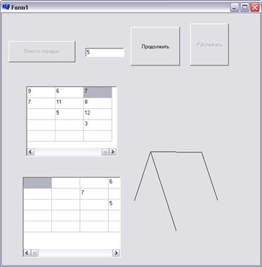 Рисунок 8 – Ребра с весом 17, 19 и 25 – не безопасные. Их концы лежат в одной компоненте связности. Ребро с весом 21 – безопасное, поэтому добавляем его. Минимальное остовное дерево построено. Время работы алгоритма Прима зависит от того, как реализована очередь с приоритетами Ω. Если использовать двоичную кучу, инициализацию в строках 1–4 можно выполнить за время O(V). Далее цикл выполняется |V| раз, и каждая операция EXTRACT-MIN занимает время O(VlogV). Цикл for в строках 8–11 выполняется в общей сложности O(E), поскольку сумма степеней вершин графа равна 2|E|. Проверку принадлежности в строке 9 можно выполнить за время O(1), если хранить состояние очереди еще и как битовый вектор размера |V|. Присваивание в строке 11 подразумевает выполнение операции уменьшения ключа (DECREASE-KEY), которая для двоичной кучи может быть выполнена за время O(logV). Таким образом всего получаем O (VlogV+ElogV)=O(ElogV). Лучшую оценку можно получить, если использовать фибоначчиевы кучи. С помощью фибоначчиевых куч можно выполнить операцию EXTRACT-MIN за учетное время O(logV), а операцию DECREASE-KEY – за учетное время O(1). В этом случае суммарное время работы алгоритма Прима составит O (E+VlogV). 4. Составление программы алгоритм остовной дерево программа Интерфейс программы (приложение А, В) должен быть следующим. Сначала пользователь вводит порядок графа, чтобы программа могла сформировать таблицу ввода данных (матрица весов) с соответствующим количеством строк и столбцов. При этом все кнопки, кроме кнопки «Сделать таблицу» недоступны для пользователя. Затем пользователь вводит в таблицу данные, при этом он может оставлять пустые ячейки в таблице. Программа будет интерпретировать это как отсутствие ребра между вершинами. Когда данные будут введены, нужно нажать на кнопку «Рассчитать дерево», которая после создания программой таблицы станет активной. Программа рассчитает матрицу весов для минимального остовного дерева и нарисует искомый граф (длины ребер графа не будут соответствовать матрице весов). При этом таблица ввода и все кнопки, кроме кнопки «Продолжить», станут недоступны для пользователя. При нажатии на эту единственную активную кнопку программа перейдет в исходное состояние. Теперь о том, как программа реализует алгоритм Прима. Сначала программа создает некий массив a[10] [10] (предполагается, что число вершин графа меньше или равно 10). Этот массив инициализируется: каждому a[i] [j] присваивается 1000 (предполагается, что максимальная длина ребра меньше 1000). Потом данные из таблицы ввода копируются в массив. При этом если в ячейке таблицы ничего не содержится в массив ничего не копируется. Затем делается цикл, который прерывается только тогда, когда все элементы массива станут снова равны 1000. Как работает цикл? Сначала находится минимальный элемент массива (из области выше главной диагонали матрицы ввода). Он запоминается (переменная buf) и ему присваивается 1000. Согласно алгоритму Прима, если ребро подходящее минимальный элемент вычеркивается, а цикл начинается с начала. Подходящее ребро или нет? Ответ на этот вопрос находится следующим образом. Создается массив в n элементов. Каждый элемент равен 1 или 0. Когда вершина включается в дерево, в элемент массива с ее номером записывается 1 (изначально все элементы массива, кроме первого равны 0). Чтобы определить подходящее ребро или нет, нужно посмотреть, наход