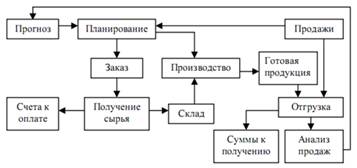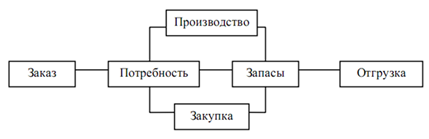 Рис. 1. Логистический взгляд на предприятие По сферам объектов система логистики предприятия подразделяется на: · производство; · систему складского хозяйства; · систему транспортировки, упаковки и обращение с материалами; · информационную систему, включая обработку заказов и систему хранения. Поток материалов, комплектующих и готовой продукции на этапах поставок, перемещения, хранения называется материальным потоком Основное направление движения материального потока: поставщики – снабжение – производство – сбыт – клиенты. Материальный поток, движущийся в физическом мире, непременно сопровождается информационным потоком, который обычно включает: · информацию о материальном потоке (что, какого качества, где находится и в каком количестве); · управленческую информацию - поток поручений, уведомлений, напоминаний о сроках и т.п., идущий в направлении, обратном материальному потоку; Финансовый поток, являясь денежным эквивалентом материального, обрабатывается в финансово-бухгалтерском контуре, получающем информацию из контура логистики. Перечисленные потоки на каждом предприятии обрабатывают агенты логистики – подразделения предприятия, выполняющие отдельные однотипные бизнес-процессы. Основные исполнительные категории агентов логистики: · Сбытовое подразделение, отвечающее за работу с клиентами и продажи; · Производственное подразделение, отвечающее за создание материальных ценностей, - объектов продажи и полуфабрикатов; · Подразделение снабжения, отвечающее за обеспечение производства и сбыта необходимыми материальными ценностями. Обслуживающие категории агентов логистики: · Складское хозяйство, отвечающее за хранение, прием и передачу материальных ценностей от снабжения, с производства – на производство, на продажу; · Транспортное хозяйство, отвечающее за движение, перемещение; · Ремонтные мастерские (могут иногда совпадать с производственным подразделением). Архитектура логистических цепочек предприятия зависит от взаимосвязи технологических цепочек и бизнес-процессов. Сквозной логистический бизнес-процесс состоит из планирования цепочки выполнения заказа (от сбыта через производство к снабжению) и функционирования цепочки в соответствии с планом выполнения заказа (в обратном порядке). Множество логистических цепочек предприятия, поддерживаемых в ERP-системах, представлено на рис. 3. На уровне предприятия различаются: · Закупочная логистика – обеспечение предприятия материальными ресурсами; · Распределительная логистика – обеспечение рационализации процесса физического продвижения продукции к потребителю и формирование системы эффективного логистического сервиса.