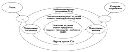 Рис. 4. Логистические цепочки распределительной логистики Цепочка состоит из следующих основных компонентов: обработка заказов на поставки, регистрация и анализ продаж, прогноз продаж, планирование ресурсов и материалов, управление запасами и складами, обработка запасов на приобретение, управление транспортом. Обработка заказов на поставки позволяет повысить качество обслуживания потребителей продукции за счет быстрого приема заказов, осуществлять проверку соответствия поставок существующим запасам и запланированному производству. Анализ продаж обеспечивает сбор статистических данных по количеству, цене и подробным затратам, а также возможности анализа и сравнения по продуктам или категориям продуктов или заказчикам для принятия решений и учета результатов при планировании. В современном мире идет непрерывный процесс объединения предприятий, в результате которого образуются холдинги, концерны, транснациональные корпорации. В связи с этим возникает задача интеграции логистики на уровне нескольких предприятий. На рис. 5 представлены 3 уровня логистических процессов: · в рамках подразделений одного предприятия; · в рамках холдинга или группы организаций; · в рамках объединения предприятий по всей производственной цепочке - от добычи (производства) сырья до изготовления конечной продукции для потребителя (вертикально интегрированные структуры с замкнутым циклом производства и реализации).