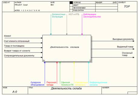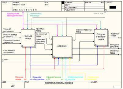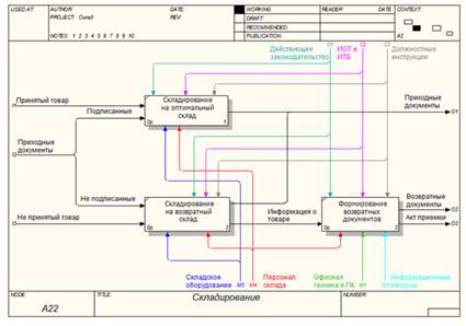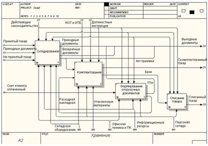 Рис.9. Диаграмма декомпозиции IDEF0. Складирование Диаграмма складирования, в свою очередь подразделяется на: · Складирование на оптимальный склад (при поступлении товара, принятого в соответствии с приходными документами). На данном этапе производится непосредственное складирование поступившего товара на оптимальный склад и передача соответствующих приходных документов для заведения товара в базу (в отделе снабжения). · Складирование на возвратный склад (при поступлении товара, не принятого в соответствии с приходными документами). На данном этапе производится непосредственное складирование поступившего товара на возвратный склад, и передача несоответствующих приходных документов для заведения товара в базу (в отделе снабжения). · Формирование возвратных документов (формирование и передача документов на комплектование товара для возврата поставщику). Заключение Внедрение ERP-системы означает переход предприятия на новый уровень функционирования, что подразумевает реинжиниринг его бизнес-процессов. Реинжиниринг бизнес-процессов предприятия осуществляется в ходе внедрения информационной системы управления предприятия, так как только при наличии должного инструмента можно реализовать все преимущества выбранных технологий управления. Реинжиниринг бизнес-процессов и эффективное внедрение ERP-системы являются взаимодополняющими процессами, повышающими эффективность решений и возврат инвестиций в ERP. В ходе такой перестройки системы управления предприятием производится определение приоритетных бизнес-процессов для эффективной работы компании, анализ и оценка их оптимальности по параметрам: издержки, качество, скорость, информация. Осуществляется построение оптимальной модели выполнения процесса. Определяются критерии качества конечного и промежуточных результатов и нормативов выполнения. Проводится переработка процессов движения информации о ходе и результатах выполнения отдельных операций, осуществляется обучение сотрудников, производится постоянный мониторинг процедуры внедрения оптимизированных бизнес-процессов. Реинжиниринг бизнес-процессов может потребовать значительных финансовых и временных затрат. Обычно к этому варианту внедрения прибегают организации, убедившиеся в неэффективности ранее существовавших бизнес-процессов и использующие ERP как повод и средство модернизации структуры и организации работы. При корректной реализации «перестройка, вызванная внедрением ERP», может привести к значительному повышению эффективности работы организации. 1.Волгин В.В. Склад. – М.: Дашков и К, 2008. - 768 с. 2.Гаджинский А. М. Логистика. Учебник для высших и средних специальных учебных заведений. – М.: Информационно-внедренческий центр «Маркетинг», 2005. - 228 с. 3.Гаджинский А.М. Современный склад. Организация, технологии, управление и логистика. Учебно-практическое пособие. – М.: ТК Велби, Издательство Проспект, 2005. - 176 с. 4.Железко, Б.А. Реинжиниринг бизнес-процессов: учеб. Пособие для вузов/ Б.А. Железко, Т.А. Ермакова, Л.П. Володько; под ред. Б.А. Железко. – Мн.: Книжный дом, 2006.- 216 с. 5.Лукинский В. С. Модели и методы теории логистики: Учебное пособие. 2-е изд. — СПб.: Питер, 2007. — 448 с: ил. — (Серия «Учебное пособие»). 6.Пушкарев Ю. Реинжиниринг бизнес-процессов –М.: Экспертиза Бизнеса и Финансов. №3. 2003. 7.Таран С.А. Как органи