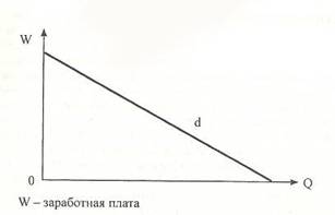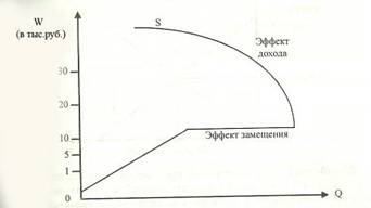 График 1 – график спроса на труд На величину спроса действует и внеценовые факторы – те, которые непосредственно не связанны с уровнем зарплаты. Внеценовые факторы разделяются на факторы предприятия и факторы отрасли. К внеценовым факторам спроса на труд, действующем на уровне предприятия, относят следующие: Во-первых, уровень цен на трудовые факторы. Все факторы производства экономически и технологически взаимосвязаны и не могут использоваться раздельно. Для производства необходимы сырье, оборудование и работники. И спрос на труд будет зависеть не только от ставок зарплаты, но и от цен на сырье и оборудование и их количественных закупок. При этом действует правила перекрестной эластичности на факторы производства. Рабочая сила и сырье – это комплекты, а работники и техника – в определенной степени субститы. Во-вторых, стоимость прироста продукции. С увеличением количества нанимаемых работников происходит уменьшение величины прироста выпуска последним принятым работником. Прием дополнительного работника не состоится, если прироста от выпуска продукции с его участием окажется ниже его зарплаты. Фактором спроса на труд на уровне отрасли является потребительский спрос, так как труд, в конечном счете, необходим для создания предметов потребления. Следовательно, спрос на труд зависит от спроса на товары, создаваемые этим трудом. Например, спрос на труд ткачих определяется спросом на ткани, создаваемые этими ткачихами. 1.4 Предложение труда Предложение труда – это способность и готовность работника предложить свои услуги за соответствующую зарплату. Субъекты предложения – индивидуальные лица, предлагающие себя в качестве работников. Предложение труда прямо пропорционально уровню заработной платы, и при её снижении предложение труда уменьшается. В процессе предложения труда могут возникнуть эффекты замещения и дохода. Эффект замещения возникает тогда, когда каждый час отработанного выгодно оплачивается заманчиво высоко для определенной категории работников. И такие работники понимают каждый час своего времени как упущенную выгоду. В результате, у них возникает желание заместить свое нерабочее время дополнительной работой при условии столь высокой оплаты. Соответственно, досуг работника замещается тем набором товаров и услуг, которые он может приобрести на прирост зарплаты. Заманчивый уровень зарплаты может быть разным для каждого работника с учетом его возраста, опыта, квалификации, образования и степени накопленного имущества. На рынке труда в целом эффект замещения проявляется как резкий рост предложения труда при данном уровне зарплаты.