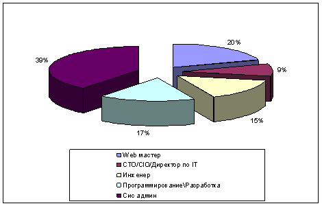 График 5 – деление специалистов в сфере «IT» по специализациям В 2007 году наибольшее количество резюме в сфере «IT» было размещено в специализациях «Системный администратор» и «Web мастер». Уровень заработных плат специалистов в сфере «IT» Наиболее высокооплачиваемые сотрудники в отрасли «IT» – директора по IT, средняя предлагаемая им заработная плата составляет 1700 долларов. Меньше всех в отрасли получают системные администраторы – 600 долларов в среднем. По специальностям предложения следующие: Таблица 2 – портрет соискателя Краснодарского края в сфере «IT»