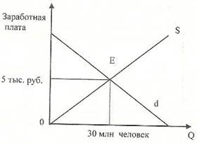 График 2 – график эффекта дохода и замещения Эффект дохода противостоит эффекту замещения и возникает при достижении работником определенного, достаточного высокого уровня материального благосостояния. В таком случае у работника появляется потребность в большом количестве свободного времени. Работник стремится перейти на сокращенный рабочий день или на сокращенную рабочую неделю, получить дополнительные выходные дни или неоплаченный отпуск. Такое состояние также неодинаково для разных категорий работников, но на рынке труда в целом эффект дохода будет выражаться в сокращении предложения труда даже при росте уровня зарплаты. Неценовые факторы, влияющие на уровень предложения труда. 1) Демографический фактор – уровень рождаемости, темпы роста численности трудоспособного населения, его половозрастная структура. Так, сокращение рождаемости заметно влияет на уровень предложения труда, уменьшая его, и наоборот. 2) Профессиональный уровень работоспособного населения. Такой уровень определяется степенью образования, квалификации, физического здоровья и ответственности рабочей силы. 3) Степень экономической активности различных социальных и этнических групп трудоспособного населения (женщины, дети, инвалиды, малые народности и т.д.). 4) Соотношение уровня иммиграции и эмиграции рабочей силы. Равенство спроса и предложения означает рыночное равновесие, при котором полностью трудоустроены все работники, готовые трудиться за данный уровень заработной платы. На графике 3 это показано точкой Е. Эта точка – показатель «полной» занятости. К занятым относятся: люди, работающие по найму или на собственных предприятиях не менее недели; люди, юридически оформленные на работу, но не работающие по временной нетрудоспособности; работники, находящиеся в отпусках.