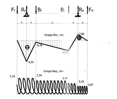 = – 241,84 + 448,36 + 214,7 – 214,7 – 300,31 + 93,8 = 0. Знайдемо значення згинальних моментів у характерних січеннях вала і побудуємо епюри згинальних моментів. Січення А: Мгор = – Ft · b = – 241,84 ∙ 0,022 = – 5,32 Н∙м. Січення 2: Мгор = – Ft · b = – 241,84 ∙ 2 ∙ 0,022 +448,36 ∙0,022 = – 0,78 Н∙м. Січення 3: Мгор = – Ft (2b + a) + RA(b + a) – B1 ∙ a = = – 241,84 · 0,252 + 448,36 · 0,23 – 214,7 · 0,208 = – 2, 47 Н·м. Січення В: Мгор = – Ft · (3b + a) + RA · (2b + a) – B1(a + b) + B2 · b = = – 241,84 · 0,274 + 448,36 · 0,252 · 214,7 · 0,23 + 214,7 · 0,022 = 2,06 Н·м. У вертикальній площині проекції сил на вісь X рівні 0. Отже визначимо значення згинальних моментів: