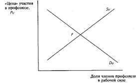 Курсовая работа: Профсоюзы и их рольКурсовая работа: Профсоюзы и их рольСодержание1. Модель участия в профсоюзах2. Цели и модели поведения профсоюзов 3. Модели процесса переговоров и забастовок 4. Профсоюзы и преимущества в заработной плате 5. Профсоюзы, распределение ресурсов и производительность Библиографический список 1. Модель участия в профсоюзах Профессиональные союзы (профсоюзы) — организации, объединяющие работников и созданные для представления и защиты их интересов. Степень участия работников в профсоюзе (или степень могущества профсоюза) показывает простая модель участия в профсоюзе (рис. 9.1). Она предполагает, что существует спрос работников на услуги профсоюза и предложение этих услуг со стороны профсоюза. Спрос работников на услуги профсоюза Du рассматривается как убывающая функция от «цены» участия в профсоюзе. «Цена» участия в профсоюзе Pu — это те издержки, которые несет работник, вступив в профсоюз: вступительный взнос, текущие взносы, альтернативная цена времени, отдаваемого работе в профсоюзной организации, и т. д. Предложение профсоюзных услуг Su рассматривается как возрастающая функция от цены участия в профсоюзе: чем больше издержки работников, тем больше профсоюз предлагает им свои услуги. Количество членов профсоюза определяется достижением равновесия (точка F) на рынке профсоюзных услуг между предложением профсоюзных услуг и спросом на профсоюзные услуги. Эта величина будет меняться в зависимости от изменения спроса и предложения на услуги профсоюза.