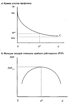 Из этой модели следует, что если работодатель и профсоюз полностью информированы о положении взаимных кривых уступок, то забастовка не имеет смысла и стороны могут прийти к соглашению без нее, не неся издержек от забастовки. Но информация несовершенна, и работодатель и профсоюз могут не знать истинного положения взаимных кривых уступок. Допустим, работодатель предполагает, что кривая уступок профсоюза F’u (рис. 9.9) и рассчитывает на длительность забастовки d1 и окончательную заработную плату W1 (W1<W*), а профсоюз предполагает, что кривая уступок работодателя F’e (рис. 9.9) и рассчитывает на длительность забастовки d2 и окончательную заработную плату W1 (W1>W*). Тогда стороны не смогут прийти к соглашению на переговорах и возникнет забастовка. Чем больше неопределенность сторон во время переговоров о поведении друг друга, тем больше вероятность забастовки. Модели забастовок, в которых по крайней мере одна из сторон при переговорах не обладает полнотой информации о возможном поведении другой стороны, называются моделями с асимметричной информацией. Модель забастовок Ашенфельтера—Джонсона, или модель политической активности, исходит из того, что профсоюзы — сложные организации, где руководство профсоюза может преследовать свои цели (в том числе политические, связанные с влиянием профсоюза и своей карьерой), отличные от целей рядовых членов профсоюза. В этой модели также существует асимметрия информации, но между руководством профсоюза и рядовыми членами: руководство профсоюза располагает полной информацией о возможностях фирмы и об уровне заработной платы, который приемлем для работодателя, но этой информацией не располагают члены профсоюза. У руководства профсоюза есть два варианта поведения. Первый — убедить членов профсоюза согласиться на уровень заработной платы, приемлемый для работодателя (этот уровень будет меньше заработной платы, требуемой профсоюзом). Но в этом случае руководство профсоюза может потерять свою репутацию и выглядеть «соглашателями». Второй — пойти на забастовку, которая будет продолжаться до тех пор, пока стороны не придут к соглашению по заработной плате на уровне, приемлемом для работодателя и известном руководству профсоюза еще до начала забастовки. При таком варианте, несмотря на издержки забастовки, руководство профсоюза приобретает политическую репутацию. Модель представлена на рис. 9.10. На рис. 9.10а показана кривая уступок профсоюза Fu, которая убывает от первоначально требуемой заработной платы Wu и приближается к минимально приемлемой для профсоюза заработной плате Wm (точка сопротивления профсоюза). В модели предполагается, что поведение работодателя определяется максимизацией текущей стоимости прибыли (PVP). При непродолжительной забастовке РVР может возрастать, так как забастовка приведет к снижению требований профсоюза по заработной плате, при более продолжительной забастовке издержки от нее превысят выигрыш, получаемый от снижения требований профсоюза по заработной плате, и РVР убывает (рис. 9.106). В результате забастовка будет иметь продолжительность d*, а заработная плата будет установлена на уровне W*, который приемлем для работодателя и максимизирует текущую стоимость его прибыли. В соответствии с этой моделью продолжительность забастовки будет возрастать, если повысится перв
