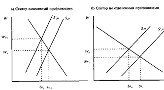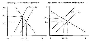 Рис. 9. 11. Влияние профсоюзов на преимущества в заработной плате (эффект перемещения) Относительное преимущество в заработной плате будет следующим:) R= (Wu1 - Wn1) / Wn1. Относительное преимущество (разрыв) в заработной плате при эффекте перемещения будет превосходить удельное абсолютное преимущество
