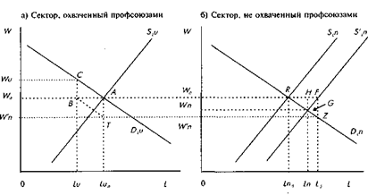 Рис. 9.13. Влияние профсоюзов на распределение ресурсов Традиционный анализ влияния действия профсоюзов на распределение ресурсов исходит из модели сравнительного анализа распределения ресурсов в двухсекторном рынке труда до и после действия профсоюзов. На рис. 9.13 представлена модель двухсекторного рынка труда, в том числе на рис. 9.1 За сектор рынка труда, охваченный профсоюзами, на рис. 9.13б сектор рынка труда, не охваченный профсоюзами. До действия профсоюзов равновесная заработная плата в обоих секторах равна W0, занятость в первом секторе Lu0, занятость во втором секторе Ln0. После действий профсоюзов заработная плата в первом секторе повышается до Wu, а занятость снижается до Lu. (Lu0 - Lu) работников переходят в поисках работы во второй сектор, сдвигая кривую предложения труда до S’Ln и увеличивая предложение труда до L2, в результате заработная плата снижается до Wn, занятость устанавливается на уровне Ln, а часть работников (L2 - Ln) покидают рынок труда, так как их резервная заработная плата выше Wn. В итоге заработная плата возросла для работников, состоящих в профсоюзе, и снизилась для работников, не состоящих в профсоюзе, общая занятость снизилась на (L2 - Ln). Кривая спроса на труд соответствует предельному денежному продукту каждого дополнительного работника, поэтому площадь под кривой спроса на труд, ограниченная текущим уровнем занятости, равна стоимости совокупного продукта. Снижение выпуска в первом секторе равно площади трапеции LuCALu0, а увеличение выпуска во втором секторе — площади трапеции Ln0RGLn. Общие потери в выпуске — это разница между этими величинами, которая состоит из площади прямоугольника LnHFL2 — потери в выпуске из-за падения общей занятости; суммы площадей двух треугольников ABC и GRH — потери в выпуске из-за перераспределения труда между секторами, которое привело к его менее производительному использованию. Если предположить, что в рассматриваемой модели в обоих секторах предложение труда совершенно неэластично, а наклон кривых спроса на труд одинаков, то потерь в выпуске из-за сокращения занятости не будет, а заработная плата во втором секторе снизится до W’n. Тогда потери в выпуске составят сумму площадей треугольников ABC и RFZ, равную площади параллелограмма ВСАТ, которую можно представить как DQ = 1/2 (Wu - W’n)(Lu0 - Lu), т. е. половине произведения абсолютного различия в заработной плате между профсоюзным и непрофсоюзным секторами на изменение занятости в профсоюзном секторе. Если кривая спроса более эластична во втором секторе, то перераспределение труда приведет к незначительной потере в выпуске в этом секторе. Если кривая спроса в секторе, не охваченном профсоюзами, совершенно эластична, то потеря в выпуске составит только площадь треугольника ABC. При альтернативной позитивной оценке влияния профсоюзов на экономическую эффективность исходят из того, что профсоюзы рассматриваются как институт «коллективного голоса» на внутренних рынках труда. Их роль заключается в том, чтобы соединить предпочтения работников непосредственно с интересами управления и, участвуя в определении правил установления заработной платы и продвижения по служебной лестнице, способствовать снижению конкуренции на внутренних рынках труда. В соответствии с этой точкой зрения такие действия профсоюзов приводят к: сокращению текучести ра