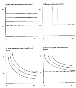 Рис. 9.1. Модель участия работников в профсоюзе На спрос на услуги профсоюза будут оказывать влияние те факторы, которые воздействуют на чистые выгоды работников от участия в профсоюзе: различия в заработной плате и вероятностях найти и потерять работу между членами профсоюза и остальными работниками, личные предпочтения, демографическая структура рабочей силы, влияющая на профиль и длительность трудовой активности, и т. д. На предложение профсоюзных услуг будут оказывать влияние факторы, воздействующие на издержки участия в профсоюзе и профсоюзной деятельности: законодательство, степень противодействия работодателей профсоюзной деятельности, отраслевая и технологическая структура экономики, степень конкуренции и т. д. 2. Цели и модели поведения профсоюзов Профсоюзы — не только экономический, но и социально-политический институт, поэтому целью их деятельности является реализация как экономических, так и политических интересов. При анализе экономической деятельности профсоюзов в экономической теории предполагается, что они стремятся улучшить для своих членов две характеристики — уровень заработной платы и уровень занятости. Поэтому их поведение может быть описано через максимизацию функции полезности профсоюзов от этих двух характеристик: U = u(W, N), где W — заработная плата членов профсоюза, а N — число работающих членов профсоюза. Или другой вариант представления функции полезности профсоюза: U = u(W, N, W0), где W0 — альтернативная заработная плата в непрофсоюзном секторе рынка труда. Возможны следующие частные случаи функции полезности профсоюза: максимизация заработной платы: U = u(W) (кривые безразличия представлены на рис. 9.2а); максимизация занятости членов профсоюза: U = u(N) (кривые безразличия представлены на рис. 9.2б); максимизация суммарной заработной платы всех работающих членов профсоюза: U = u (WN) (кривые безразличия представлены на рис. 9.2в); максимизация экономической ренты работающих членов профсоюза U = u[(W - W0)N], где W0 — альтернативная заработная плата в непрофсоюзном секторе рынка труда (кривые безразличия представлены на рис. 9.2г). На рис. 9.3 показаны решения для каждого частного случая функции полезности профсоюза за исключением случая максимизации заработной платы. Для него решением будет занятость одного работника — члена профсоюза с заработной платой чуть меньше W3. Для случая максимизации занятости членов профсоюза решением будет точка G, уровень занятости N0, заработная плата W0, равная заработной плате вне профсоюзного сектора. Таким образом, для фирмы и работников не будет разницы между решением о занятости и заработной плате при наличии и при отсутствии профсоюзов.