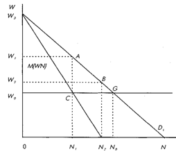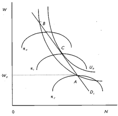 Рис. 9.2. Цели профсоюзов (частные случаи функции полезности) Для случая максимизации суммарной заработной платы (WN) решением будет точка В, в которой эластичность спроса на труд равна -1 (eD = -1) и предельная суммарная заработная плата будет равна 0 (M(WN) = 0). Заработная плата при этом будет равна W2, а уровень занятости N2. Суммарная заработная плата будет равна площади прямоугольника W2BN20. Для случая максимизации ренты решением будет точка А с заработной платой W1, уровнем занятости N1. В этом случае профсоюз ведет себя аналогично монополии на рынке продукта, уровень занятости определяется горизонтальными координатами точки С, в которой предельная суммарная заработная плата равна альтернативной заработной плате предложения в непрофсоюзном секторе (M(WN)= W0). Все рассмотренные решения для различных случаев функции полезности профсоюзов лежат на кривой спроса на труд DL. Представив функцию полезности профсоюзов как U = u(W, N) и функцию спроса на труд как N = n(W), можно получить, что для точки максимизации полезности профсоюзов - UW / UN = NW, т. е. предельная норма замещения полезности от заработной платы полезностью от занятости членов профсоюзов равна наклону кривой спроса на труд. Таким образом, максимизирующее полезность профсоюзов решение подчиняется ограничению спроса на труд.
