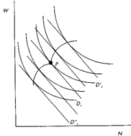 Рис. 9.3. Заработная плата и занятость, максимизирующие различные функции полезности профсоюзов Подход, основанный на функции полезности профсоюза, позволяет проанализировать реакцию профсоюза на сдвиг кривой спроса на труд. На рис. 9.4 показана линия предпочтения заработной платы в случае увеличения или в случае уменьшения спроса на труд. Реакция профсоюза будет асимметрична. Если точка Р отражает позицию максимизации полезности
