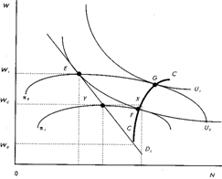 Рис. 9.5. Модель «право на управление» Максимизация полезности профсоюза происходит в точке С, максимизация прибыли работодателя в точке А при уровне заработной платы, равной W0. Решение о занятости и заработной плате будет достигнуто в результате переговоров между профсоюзом и работодателем и будет расположено на отрезке СА кривой спроса на труд. В случае модели профсоюза-монополиста решение будет находиться в точке С, профсоюз определяет уровень заработной платы, а работодатель в ответ на это определяет уровень занятости. Альтернативой модели «право на управление» является модель эффективных переговоров. Как видно из рис. 9.5, решение в модели «право на управление» не является эффективным по Парето. При максимизации полезности профсоюза до U0 в точке С для работодателя решение будет определяться пересечением кривой спроса на труд и кривой изоприбыли в точке С, но этот же уровень полезности профсоюза может быть достигнут и при более выгодном для работодателя уровне прибыли, если решение будет лежать вне кривой спроса на труд. На рис. 9.6 представлена модель эффективных переговоров. Точка Е, соответствующая заработной плате W1 и занятости N1, является равновесным решением профсоюза-монополиста. Передвижение из точки Е в точку G приводит к увеличению полезности профсоюза от U0 к U1, в то же время уровень прибыли работодателя не меняется, он остается на той же самой кривой изоприбыли p0. Точка G (точка касания кривой безразличия профсоюза и кривой изоприбыли) представляет наиболее высокий уровень полезности, которого может достичь профсоюз, не уменьшая прибыли работодателя. При передвижении из точки Е в точку F, наоборот, профсоюз остается на той же самой кривой безразличия с полезностью U0, а работодатель переходит на кривую изоприбыли, соответствующую более высокому уровню прибыли p1. Соответственно точка F (точка касания кривой безразличия профсоюза и кривой изоприбыли) представляет максимальный уровень прибыли, которого может достичь работодатель, не уменьшая полезности профсоюза. Кривая СС соединяет все точки касания кривых безразличия профсоюза и кривых изоприбыли работодателя и называется контрактной кривой. Все точки, лежащие на ней, удовлетворяют условиям оптимальности по Парето и называются Парето-эффективными или эффективными. Следовательно, обе стороны выигрывают при перемещении от точки равновесной полезности профсоюза-монополиста Е в любую из точек на контрактной кривой между точками G и F (например в точку X с уровнем занятости NC и ставкой заработной платы WC).