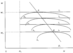 N1 N2 NC Рис. 9.6. Модель эффективных переговоров Модель эффективных переговоров, во-первых, предсказывает, что решение не будет лежать на кривой спроса на труд, во-вторых, не имеет единственного равновесного решения, а задает возможный интервал для переговоров. Сравнивая модель «право на управление» и модель эффективных переговоров, следует отметить, что в первой модели решение приводит к меньшему уровню занятости, чем на конкурентном рынке труда, во второй модели — к большему уровню занятости, чем на конкурентном рынке труда. В модели доминирующего инсайдера (или модели с плоскими кривыми безразличия) эффективные решения лежат на кривой спроса на труд, объединяя модель «право на управление» и модель эффективных переговоров.