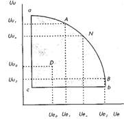 Рис. 9. 7. Модель доминирующего инсайдера В модели доминирующего инсайдера (рис. 9.7) кривые безразличия профсоюза являются горизонтальными линиями. Это означает, что полезность профсоюза есть возрастающая функция только от ставки заработной платы U = u(W), и он безразличен к занятости. В основе такого предположения лежит правило первоочередного увольнения работников с маленьким стажем работы («последним пришел — первым ушел»). Работники с большим стажем (инсайдеры) могут не опасаться увольнения и, имея большинство в профсоюзе, устанавливать требования только о повышении заработной платы, не заботясь о последствиях для занятости (позиция доминирующего инсайдера). Но такая ситуация сохраняется только до тех пор, пока увольнение может затронуть работника со средним стажем (медианного работника N0), поэтому кривые безразличия профсоюза I0, I1, I2, I3 сохраняют свой вид только до точки N0. Точки касания кривых изоприбыли работодателя p0, p1, p2, p3 и кривых безразличия функции полезности профсоюза I0, I1, I2, I3 лежат на кривой спроса на труд DL, поэтому кривая эффективных контрактов в данном случае совпадет с отрезком кривой спроса на труд. Если точка А соответствует кривой изоприбыли p0 с нулевым уровнем прибыли, то при монопольном поведении профсоюза максимизирующий его полезность уровень заработной платы был бы W1. Если исходить из модели эффективных переговоров, то решение (заработная плата) находилось бы на кривой эффективных контрактов — участке кривой спроса на труд между точками А и В, где кривая безразличия профсоюза I0 совпадает с уровнем альтернативной заработной платы W0. 3. Модели процесса переговоров и забастовок профсоюз переговоры забастовка работник Из анализа моделей поведения профсоюзов и фирм следует, что не всегда существует единственное решение, а возможно некоторое множество решений. Возникает проблема переговоров между профсоюзом и работодателем. Модели, анализирующие переговоры, можно разбить на две группы: первая — модели о результатах переговоров (к ним относятся рассмотренные модели поведения профсоюзов), вторая — модели процесса переговоров. В целом проблему переговоров между профсоюзами и работодателем можно представить следующим образом (рис. 9.8). Существуют функция полезности профсоюза Uu и функция полезности работодателя Ue, в пространстве значений этих двух полезностей есть точка с, называемая конфликтной точкой или точкой угрозы, которая является решением проблемы, существующей между профсоюзом и работодателем, без переговоров, с минимально допустимой для каждого полезностью. В ходе переговоров возможно также достижение других решений, максимально увеличивающих полезность профсоюзов до точки а и полезность работодателя до точки b. Добровольность переговоров и требование максимизации полезности будут ограничивать это множество сектором cab — Парето-эффективных решений, границей ab которого будет кривая эффективных контрактов. В этом множестве есть точки, которые улучшают положение обеих сторон (например, точка D), и поэтому решения, приводящие к ним, могут быть достигнуты в ходе переговоров сравнительно легко и без конфликтов. Когда при существующей силе сторон такие решения исчерпаны и переговоры приводят к точке N, дальнейшее улучшение положения одной из сторон может быть осуществлено только при ух