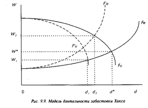 Рис. 9.8. Проблема переговоров полезность работодателя, переход в точку В от точки N, наоборот, увеличит полезность работодателя, но уменьшит полезность профсоюза. Возникает конфликтная ситуация, которая может быть разрешена только с учетом переговорной силы каждой из сторон. Таким образом, конкретный исход переговоров будет определяться силой каждой из сторон, участвующей в переговорах. Определение этой силы основано на модели Чемберлена. Согласно этой модели переговорная сила каждой из сторон, участвующей в переговорах, может быть определена через издержки, которые возникают при принятии того или иного решения. Сила убеждения профсоюза, или по-другому отношение работодателя к аргументам профсоюза, будет определяться через издержки работодателя: Издержки работодателя по несоглашению с профсоюзом Сила убеждения профсоюза = ———————————————. Издержки работодателя при соглашении с профсоюзом Издержки несогласия работодателя будут определяться в зависимости от вероятности забастовки, ее продолжительности, потери в прибылях от забастовки. Издержки согласия работодателя будут определяться через потери в прибылях при принятии условий профсоюза. Сила убеждения работодателя, или отношение профсоюза к аргументам работодателя, будет определяться через издержки профсоюза: Издержки профсоюза по несоглашению с работодателем Сила убеждения работодателя = ———————————————. Издержки профсоюза при соглашении с работодателем Издержки несогласия профсоюза будут определяться затратами на проведение и организацию забастовки, потерями в заработной плате во время забастовки. Издержки согласия профсоюза будут определяться в потерях полезности профсоюза (комбинации потерь в занятости и заработной плате) при принятии условий работодателя. Следствия из этой модели следующие: соглашение возможно при определенном соотношении сил сторон, если сила убеждения и работодателя и профсоюза £ 1, то ни тому, ни другому соглашение невыгодно; силы сторон в переговорах относительны (чем больше первоначальные требования, тем больше сопротивление противоположной стороны, тем меньше переговорная сила); если требования пересматриваются в процессе переговоров (в сторону снижения), то изменяются переговорные силы и достижение соглашения становится более возможным; конфликты (забастовки, локауты) могут возникать при неправильной первоначальной оценке сторонами издержек друг друга; усиление своей позиции в ходе переговоров возможно двумя способами: первый способ вынуждения — увеличение издержек оппонента при несоглашении с выдвигаемыми требованиями; второй способ убеждения — убеждение оппонента в меньшем, чем он предполагал, размере издержек при соглашении с выдвигаемыми требованиями. Определение издержек сторон при переговорах позволяет рассмотреть модели забастовок. Модель длительности забастовки Хикса предполагает, что переговоры между работодателем и профсоюзами сведены к одному вопросу — размерам заработной платы (W). При увеличении длительности забастовки (d) и соответственно издержек от нее профсоюзы снижают свои первоначальные требования по заработной плате, что отражает на рис. 9.9 кривая уступок (или кривая сопротивления) профсоюза Fu. Работодатели также при увеличении длительности забастовки и повышении 