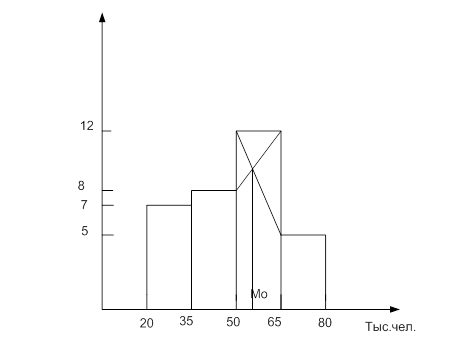 Первоначально по наибольшей частоте признака определим модальный интервал. Наибольшее число районов – 12 – имеют среднесписочную численность работников в интервале 50 – 60 тыс.чел., который и является модальным. Мо = Мо = Наиболее часто встречаемая среднесписочная численность работников 55,45 тыс.чел.