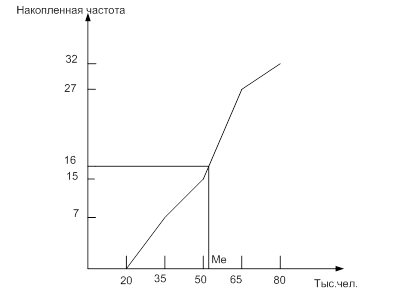 Медианным интервалом является 50 – 65 тыс.чел.