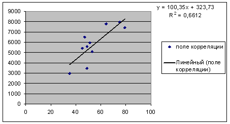 Рис. 3 Поле корреляции Построим линейную модель: у=а1+в1х С помощью Excel мы можем записать уравнение линейной регрессии: У=100,35х+323,73. коэффициент детерминации R2=0,6612, т.е. 66,12% вариаций у описываются вариациями х. Расчетная таблица представлена в приложении Б. Для определения зависимости между доходов от собственности и среднедушевых доходов найдем коэффициент корреляции: