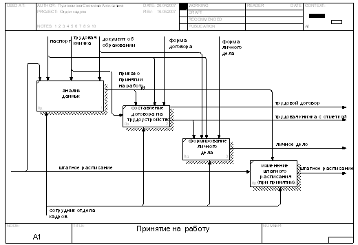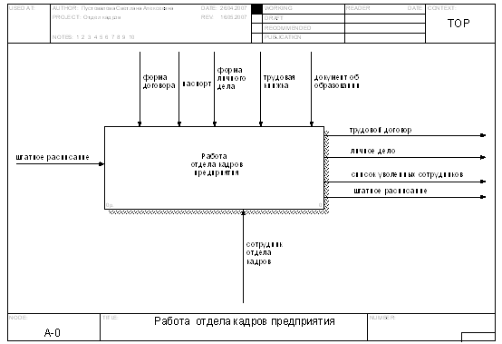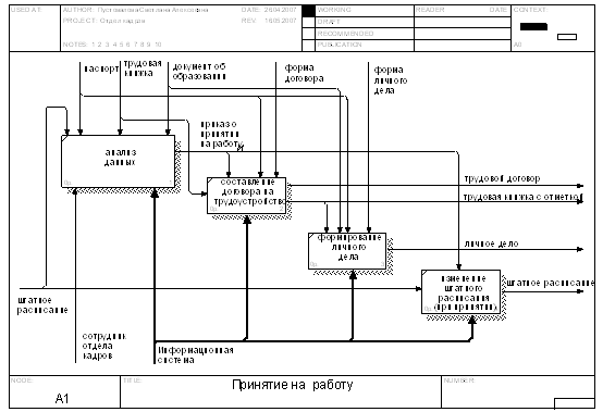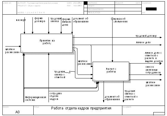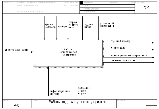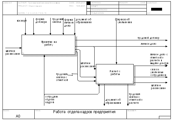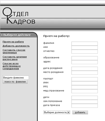Рисунок 1 – Главная страница На рисунке 1 представлена главная страница приложения "Отдел кадров". Данная страница разбита на две функциональные области, левая область содержит ссылки на дополнительные страницы (область навигации), а правая является рабочей областью и содержит форму, заполняемую при приеме на работу. На основании введенных данных формируется трудовой договор. После приема нового сотрудника, необходимо внести дополнительные данные для формирования личного дела (опись приобщенных к делу документов и трудовая история сотрудника). При переходе по ссылке "Добавить должность" в рабочей области открывается форма "Должность", предназначенная для редактирования списка должностей (добавление новой должности, удаление). При переходе по ссылке "Составить список уволенных" в рабочей области открывается список всех уволенных сотрудников. На данной странице реализован фильтр, предназначенный для выборки сотрудников, уволенных за указанный период. При переходе по ссылке "Составить штатное расписание" открывается штатное расписание сотрудников. Штатное расписание сотрудников представляет собой таблицу, содержащую должность и количество сотрудников, работающих по этой должности. При переходе по ссылке "Список всех действующих сотрудников" открывается список действующих сотрудников. На данной странице реализованы функции увольнения и просмотра всех данных сотрудника. Также в программе реализована функция поиска сотрудников по фамилии. Результатом выполнения функции является таблица, содержащая всех сотрудников, удовлетворяющих условию поиска. Заключение информационный автоматический документация интерфейс Для выполнения данного курсового проекта было проведено детальное изучение предметной области. В ходе проделанной работы были решены следующие задачи: 1) Изучена предметная область, итогом которой является словесное описание и формализованное описание предметной области в виде схем BPWIN (AS IS и TO BE); 2) Выполнено проектирование структуры базы данных в среде case-средства ERWIN в виде инфологической и даталогической моделей; 3) Создана база данных в СУБД mySQL 5.0; 4) Спроектировано и создано приложение "Отдел кадров" с использованием Web-технологий (php+mySQL+Apache). Разработанный программный продукт имеет удобный интерфейс, интуитивно-понятные связи между диалогами ввода информации. В итоге проделанной работы был создан готовый программный продукт и достигнуты основные цели разработки: а) уменьшение времени выполнения каждой функции; б) автоматическое создание документации и отчетов; в) простой и быстрый поиск; г) автоматическое проставление дат и табельных номеров. Литература 1) Аарон И.Волш Основы программирования на Java для World Wide Web .- IDG Books Worldwide,Inc.,1996, Издательство "Диалектика",1996 2) http://www.mysql.com 3) http://www.cltforum.ru/ 4) http://webims.virtualave.net/ 5) http://www.php.net/download-docs.php 6) http://www.w3.org 7) www.spravkaweb.ru 8) http://www.php.net/docs.php 9) http://www.superbest.ru ТЕХНИЧЕСКОЕ ЗАДАНИЕ 1. Введение, краткая характеристика области применения программы Краткая характеристика области применения программного объекта: Отдел кадров осуществляет все функции, связанные с устройством на работу и увольнением с работы. Отдел кадров – это одна из тех областей, где приходится иметь дело с большим объемом информации. Применение информационных технологий позволяет автоматизировать работу с бо