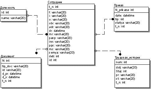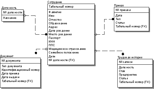 Рисунок 1 – Схема сущностей Следующим этапом проектирования инфологической модели является детализация атрибутов сущностей. На этом этапе также проверяется соответствие полученной модели нормальным формам. Каждой сущности приписываются: 1. Первичный ключ; 2. Внешние ключи соответственно типам связей; 3. Атрибуты; В приведенных ниже пунктах одинарной чертой обозначен первичный ключ – позволяет с помощью минимального набора атрибутов определить экземпляр сущности, а двойной чертой – внешний ключ. Каждой сущности приписываются атрибуты: - Сотрудник (Табельный номер, фамилия, имя, отчество, образование, адрес, дата рождения, место рождения, паспорт, ППС, медицинское страхование, ИНН, семейное положение, дети, номер должности); - Должность (Номер должности, название); - Приказ (Номер приказа, дата, тип, статья, табельный номер); - Трудовая история (Номер записи, должность, стаж, предприятие, статья увольнения, табельный номер); - Документ (Номер документа, тип, идентификационный номер, дата приема, дата выдачи, табельный номер ). Таким образом, получаем инфологическую модель данных, представленную на рисунке 2.