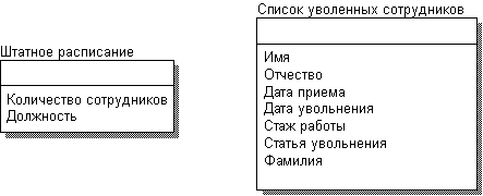Рисунок 3 – Даталогическая модель Для составления отчетов и запросов на основе представленной модели были созданы временные таблицы "Штатное расписание" и "Список уволенных за период" (см. рисунок 4).