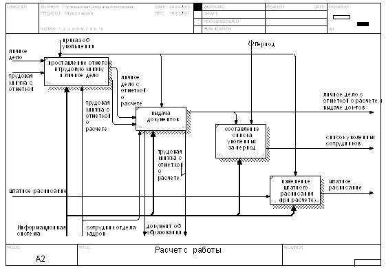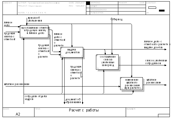 Курсовая работа: Разработка автоматизированной информационной системы работы отдела кадровКурсовая работа: Разработка автоматизированной информационной системы работы отдела кадровФедеральное Агентство по образованию Российской Федерации Государственное образовательное учреждение высшего профессионального образования Курсовой проект По курсу: "Базы данных" Тема: "Разработка автоматизированной информационной системы работы отдела кадров" Содержание Введение 1. Словесное описание предметной области 2. Формализованное описание предметной области 3. Построение информационной модели 4. Описание приложения Заключение Литература Приложения Введение В настоящее время, в мире непрерывного потока информации, все большую актуальность приобретают процессы автоматизации работ рутинного характера и работ, трудно поддающихся формализации. В связи с этим ежегодно разрабатываются программы, призванные решить возникающие проблемы. На реализацию одной из таких проблем и направлено разрабатываемое программное обеспечение. Данное программное обеспечение призвано максимально упростить и автоматизировать работу с большими объемами информации. Создание информационной системы предполагает, что основные операции по накоплению, хранению и переработке информации возлагается на вычислительную технику, специалист же выполняет только определенную часть ручных операций и операций, требующих творческого подхода при подготовке управленческих решений. Вычислительная техника при этом работает в тесном взаимодействии с пользователем, который контролирует ее действия, меняя значения отдельных параметров в ходе решения задачи, а также вводит исходные данные для решения задач и функций управления. Темой данного курсового проекта является информационная система отдела кадров предприятия. Работа отдела кадров достаточно крупного предприятия связана с накоплением большого количества информации о личных данных сотрудников. Традиционно информация храниться на бумажных носителях. При этом трудно осуществить быстрый отбор нужных данных при приеме на работу, увольнении, составлении отчетов. Основанием разработки послужил ряд причин, возникающих в силу влияния человеческого фактора, которые отрицательно сказываются на качестве и интенсивности работы отдела кадров: а) возможность случайной ошибки в ручном заполнении бланков; б) невозможность быстро справиться с большим объемом информации; в) сложность поиска необходимой информации; Целью разработки является максимально возможное устранение случайных ошибок, перечисленных недостатков существующей системы работы отдела кадров, и привнесение в нее факторов, положительно влияющих на качество и сроки выполнения реализуемых в ней функций: а) уменьшение времени выполнения каждой функции; б) автоматическое создание документации и отчетов; в) простой и быстрый поиск; г) автоматическое проставление дат и табельных номеров; Все вышеперечисленное свидетельствует об актуальности проблемы, вариант решения которой представлен в данном курсовом проекте. 1. Словесное описание предметной области Основные функции по работе отдела кадров предприятия: 1. принятие на работу 2. расчет с работы Для подробного описания можно разбить основные функции на ряд дополнительных. Так, например, при