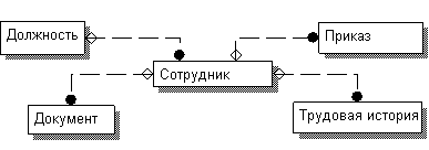 3. Построение информационной модели Для проектирования информационной модели использовалось CASE-средство ERwin, в результате чего была получена модель сущность-связь. В ней определены все основные объекты (сущности) и связи, которые существуют между ними. Были выделены 5 сущностей: "Должность", "Сотрудник", "Приказ", "Трудовая история" и "Документ" (см. рисунок 1).