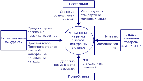 Рисунок 8. Матрица конкуренции М. Портера Возможные риски при реализации стратегии следующие: 1. Технологический прорыв: появление вариантов оборудования, которые лучше и дешевле продукции ООО "Веза". Этот риск гипотетический, вероятность наступления события чрезвычайно мала. 2. Создание конкурирующего производства в регионе с дешёвой рабочей силой. Разница в стоимости производства не так уж и велика; к тому же срок строительства завода измеряется годами. За это время есть возможность переориентировать производство и подготовить ответ на действия конкурентов. 3. Опасность экспорта дешёвого товара из Китая. Эта опасность затронет всю отрасль и несёт риск сокращения рабочих мест в России. Поэтому при таком развитии ситуации следует рассматривать вопрос на уровне отрасли. Несмотря на активность конкурентов, ООО "Веза" прочно занимает свою рыночную нишу. Это позволяет предприятию реализовывать свою конкурентную стратегию в рамках развития. Комплексное рассмотрение задачи позволяет снизить издержки при использовании результатов работы одного направления на других рынках. Риски предприятия не так значительны, что позволяет ограничиться упреждающими мерами наблюдения за рынком. Глава 3. Бизнес-план ООО "Веза" на 2010 год 3.1 Резюме бизнес-плана Работа является проработкой деятельности компании на ближайшую перспективу с горизонтом планирования год. Целью настоящего бизнес-плана является реализация тех стратегических направлений деятельности компании, которые были начаты в успешном для предприятия 2007 году, но, в связи с экономическим кризисом были отложены. Сейчас, несмотря на то, что никто из экспертов не даёт точных прогнозов по рынку, стало ясно, какие предприятия-партнёры устояли и готовы наращивать обороты. Реализация проекта позволит повысить эффективность предприятия, усилить мотивацию сотрудников. Также такая стратегия позволит диверсифицировать деятельность компании и выделить управляющий центр. Сильной стороной предприятия являются современное оборудование, сильный НИОКР и высокая степень интеграции - практически все системы вентиляции от ООО "Веза" созданы из собственных компонентов. К тому же предприятие является признанным лидером в производстве отдельных элементов и снабжает ими большую часть строек России. Перспективное направление развития предприятия - это диверсификация со специализацией отдельных направлений деятельности. Выйдя за рамки своего сегмента ООО "Веза" может завоевать весь рынок и стать универсальной компании в своей отрасли. В бизнес-плане используются знания трансформации рынка в связи с переходом на новую стадию жизненного цикла товара. Это позволяем изменять предприятие "на опережение", создавая задел для будущих успехов. К тому же управляющий центр будет координировать взаимодействие компании с рынком, что позволит максимально эффективно осуществлять маркетинговую и сбытовую деятельность. Для реализации этих планов необходимо окончательно выделить направления в отдельные проекты, создать для них свою мотивацию, планирование, контроль. Это даст возможность специалистам предприятия раскрыть свои возможности и принести прибыль компании. Для осуществления этой работы проекту не нужны заёмные средства, финансовые ресурсы на осуществление задуманного будут получены из 