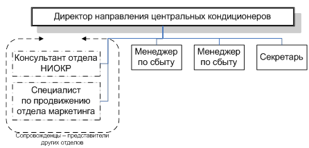 Для организации производства новой продукции будут созданы подразделения в рамках существующего завода. Создание новых юридических лиц под осуществление проектов признано нецелесообразным. Три задачи из четырёх уже решаются в рамках существующей оргструктуры. Необходимо создать отдел для сбыта центральных кондиционеров. Стартовая структура отдела - проектная, в ней используются как полностью занятые сотрудники, так и прикомандированные специалисты других отделов (первоначально - отделов маркетинга и НИОКР). Такая организация работы выбрана из-за масштабируемости, гибкости и возможности использовать лидерские качества руководителя проекта: