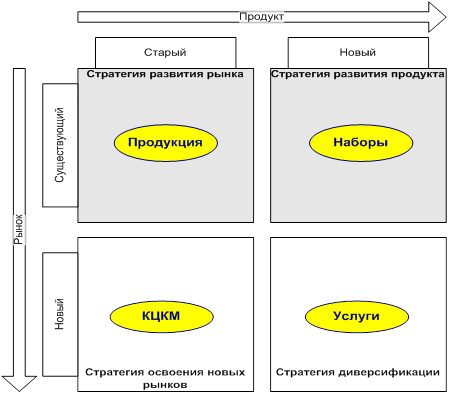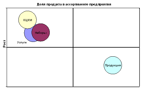 Проект развития предусматривает диверсификацию деятельности предприятия - при увеличении общего объёма продукции снижается значимость основного направления работы - производства компонентов систем вентиляции и кондиционирования, и растёт доля услуг и других товаров. Такой подход отвечает требованиям рынка кондиционирования и вентиляции и позволит усилить свои позиции на этом рынке, не потеряв специализации. Воспользуемся для этого матрицей БКГ, которая позволит определить особенности подхода к каждой из групп товаров. [8] Так, как ни один из экспертов не может определить точных перспектив развития рынка на 2010 год, при построении матрицы мы получим указание на нахождение конкретного продукта на кривой жизненного цикла товара.