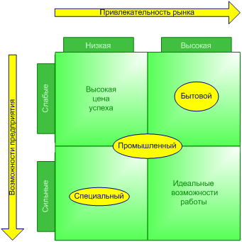 Сопоставив между собой особенности направлений развития предприятия. Приходим к выводу, что сегментация для новых задач не нужна, так как там используется прямой контакт с потребителем - один клиент = один сегмент. К тому же сложно выполнить задачу при более крупной сегментации - необходимо, чтобы сегмент работа в сегменте была экономически выгодна. Исходя из этой неопределённости, будем сегментировать рынок, на который ориентируется основное производство продукции - рынок вентиляционного оборудования. Его можно разделить по назначению оборудования на три сегмента: Бытового и полупромышленного назначения. Промышленного назначения. Вентиляционное оборудование "специального" назначения. Работа на каждом из этих сегментов требует своего подхода. Для того, чтобы оценить перспективность работы в каждом из них, сопоставим возможности предприятия с обещанием сегментов. Результаты этого рассмотрения сведём в таблицу: Таблица 6 Сравнение сегментов рынка вентиляционного оборудования