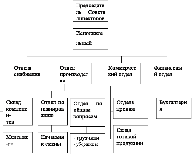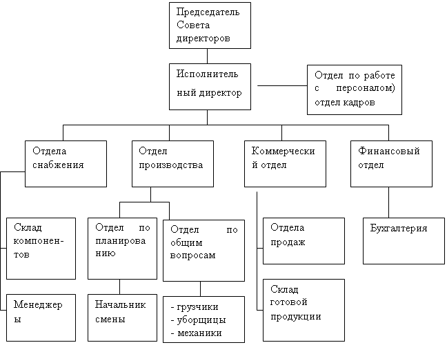 Рис. 4. Организационная структура предприятия Формирование отдельных органов и аппарата управления в целом основывается на наличии определенных функций, их объеме, масштабе управляемости и особенностях объекта управления. Структура управления предприятием «Гламур» удовлетворяет следующим основным требованиям: - соответствует функциональному содержанию процесса управления предприятием; - имеет в своем составе органы для связи с вышестоящими уровнями управления; - обеспечивает постоянное прогрессивное развитие управляемого объекта; - обладает внутренним потенциалом для совершенствования, восприятия и использования новейших достижений науки и практики управления. В структуре предприятия ООО «Гламур» выделено 4 звена, которые управляют производством, снабжением, коммерческой деятельностью и финансами. В Приложении 2 раскрыты функциональные обязанности сотрудников на каждом уровне структуры управления. Отношения между элементами структуры управления поддерживаются благодаря связям, которые принято подразделять на горизонтальные и вертикальные. Первые носят характер согласования и являются одноуровневыми. Вторые - это отношения подчинения. Необходимость в них возникла при иерархичности построения системы управления, то есть при наличии различных уровней управления, на каждом из которых преследуются свои цели и функции. Функции в системе управления ООО «Гламур» - Общее (линейное) руководство основным производством; - Техническая и технологическая подготовка производства; - Контроль качества сырья и готовой продукции; - Служба ремонта оборудования, зданий, сооружений; - Оперативное управление основным производством; - Технико-экономическое планирование; - Организация труда и заработной платы; - Бухгалтерский учет и финансовая деятельность; - Материально-техническое снабжение; - Сбыт. Таким образом, организационная структура предприятия основана на жестком единоначальном подчинении и имеет линейный тип управления Преимущества данной структуры на ООО «Гламур»: · четкая система взаимных связей функций и подразделений; · четкая система единоначалия - один руководитель сосредотачивает в своих руках руководство всей совокупностью процессов, имеющих общую цель; · ясно выраженная ответственность; · быстрая реакция исполнительных подразделений на прямые указания вышестоящих. Недостатки организационной структуры управления: · отсутствие звеньев, занимающихся вопросами стратегического планирования; в работе руководителей практически всех уровней оперативные проблемы ("текучка") доминирует над стратегическими; · тенденция к волоките и перекладыванию ответственности при решении проблем, требующих участия нескольких подразделений; · малая гибкость и приспособляемость к изменению ситуации; · критерии эффективности и качества работы подразделений и организации в целом - разные; · тенденция к формализации оценки эффективности и качества работы подразделений приводит обычно к возникновению атмосферы страха и разобщенности; · большое число "этажей управления" между работниками, выпускающими продукцию, и лицом, принимающим решение; · перегрузка управленцев верхнего уровня; · повышенная зависимость результатов работы организации от квалификации, личных и деловых качеств высших управленцев. Вывод: недоста