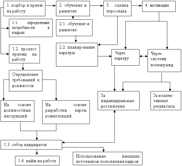 Курсовая работа: Разработка стратегии развития персонала предприятия на примере ООО "Гламур"Курсовая работа: Разработка стратегии развития персонала предприятия на примере ООО "Гламур"ФЕДЕРАЛЬНОЕ АГЕНТСТВО ПО ОБРАЗОВАНИЮ (РОСОБРАЗОВАНИЕ) ПЕНЗЕНСКАЯ ГОСУДАРСТВЕННАЯ ТЕХНОЛОГИЧЕСКАЯ АКАДЕМИЯ КУРСОВАЯ РАБОТА на тему: «Разработка стратегии развития персонала предприятия на примере ООО «Гламур»». ПЕНЗА 2011г. Содержание стратегия управление персонал Введение 1. Теоретические основы проектирования системы управления персоналом 1.1 Сущность и содержание управления персоналом 1.2 Особенности систем управления персоналом 1.3 Организационные структуры управления персоналом 2. Организационно-экономический анализ существующей стратегии управления персоналом ООО «Гламур» 2.1 Общая характеристика ООО «Гламур». Трудовой потенциал ООО «Гламур» 2.2 Анализ управления персоналом в организации ООО «Гламур» в рамках стратегии управления предприятием 3. Совершенствование стратегии управления персоналом ООО «Гламур» 3.1 Разработка новой стратегии управления персоналом ООО «Гламур» 3.2 Расчет социально-экономического эффекта от внедрения разрабатываемой стратегии управления персоналом Заключение Список использованных источников Введение Перед любой фирмой всегда будет стоять вопрос – «Что делать дальше? Как развиваться?» – это и есть вопрос стратегического развития фирмы. Значит, на любом этапе развития экономики как науки и на любом этапе развития экономической системы государства всегда будут оставаться актуальными вопросы стратегического развития фирмы. С другой стороны, чем как ни внешней и внутренней средой может определяться стратегия фирмы? – этим обосновывается актуальность исследования настоящей дипломной работы, посвященной выбору стратегии развития фирмы в результате анализа внешней и внутренней среды организации. А. Чандлер, автор одной из пионерских работ в области стратегического планирования, считает, что стратегия – «это определение основных долгосрочных целей и задач предприятия и утверждение курса действий и распределения ресурсов, необходимых для достижения этих целей» [3, с. 5]. Определение стратегии Чандлера дополняется требованием экономичности для принимаемых курсов действий «Стратегическая альтернатива определяется путём сопоставления возможностей и ресурсов корпорации с учётом приемлемого уровня риска». Стратегия управления персоналом является частью стратегии управления предприятием. К разработке стратегии управления персоналом применимы те же принципы, что и к разработке стратегии управления предприятия в целом. Следовательно, актуальность данной курсовой работы – «Разработка стратегии управления персоналом ООО «Гламур» – обусловлена важностью вопросов стратегического развития предприятия; в свою очередь персонал – это тот ресурс предприятия, который реализовывает стратегию развития предприятия, делает достижение целей деятельности этого предприятия. Данная курсовая работа посвящена разработке стратегии управления персоналом на предприятии ООО «Гламур». Целью работы является разработка стратегии управления персоналом предприятия ООО «Гламур». Задачами курсовой работы являются: 1) обзор научной и учебно-методической литературы по теме исследования; 2) анализ существую