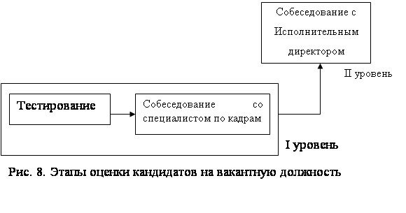Рис. 7. Место отдела кадров в орг.структуре предприятия Для введения в организационную структуру предприятия отдела кадров (отдела по работе с персоналом) разработаем проект Положения по отделу кадров. Проект Положения по отделу кадров 1. Общие положения 1. Отдел по работе с персоналом является структурным подразделением ООО "Гламур" и действует в соответствии с настоящим Положением. 2. В своей работе Отдел по работе с персоналом руководствуется действующим законодательством, директивными документами правительственных органов Российской Федерации в части обучения кадров и работы кадровых служб, приказами и указаниями Организации, Исполнительного директора, курирующего заместителя. 3. Отдел по работе с персоналом организует и осуществляет многопрофильную деятельность по работе с персоналом Организации и его филиалов, с учащимися учебных заведений. 4. Совместно с руководителями структурных подразделений Организации, общественными организациями отдел проводит работу по обеспечению строгого соблюдения трудовой дисциплины и несет ответственность за организацию работы с персоналом. 2. Состав отдела по работе с персоналом Количественный состав определяется таким образом, что на каждого работника Отдела должно приходиться по 120 сотрудников Организации. В соответствии с задачами и функциями отдела на каждого сотрудника разрабатываются должностные инструкции. 3. Основные задачи и функции Отдел: - на основании анализа состояния деятельности Организации и филиалов, перспективах развития, укомплектованности кадрами, определяет потребности в работниках различных специальностей, составляет банк данных по всем должностям и профессиям, осуществляет контроль за рациональным их использованием; - составляет все необходимые документы по приему, перемещению и увольнению работников Организации; - оформляет работникам Организации все виды отпусков и больничных листов, подготавливает материалы на награждение и поощрение, оформляет и назначает пенсии; - подготавливает приказы на выплату сотрудникам всех предусмотренных соответствующими положениями вознаграждений; - составляет установленную статистическую отчетность; - ведет всю установленную кадровую документацию, подготавливает необходимые материалы и документы для руководства Организации и вышестоящих организаций; - формирует и работает с резервом (подбор, отбор, комплексное социолого-психологическое исследование и изучение резерва; выдача рекомендаций по его дальнейшему использованию; составление банка данных резерва; социально-психологическое обучение); - изучает и анализирует уровень профессиональных знаний персонала, определяет потребности в повышении его квалификации, подготовки и переподготовки, организует мероприятия по обучению персонала. 4. Права отдела по работе с персоналом 4.1. Отдел по работе с персоналом имеет право: - получать от структурных подразделений Организации информацию по вопросам работы с персоналом; - осуществлять контроль за повышением деловой квалификации сотрудников Организации и филиалов; - осуществлять деловые контакты с соответствующими структурными подразделениями аппарата и учреждений Организации, другими организациями, учреждениями и ведомствами. 4.2. Штаты Отдела по работе с персоналом утверждаются Исполнительным директо