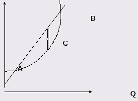 Данный график иллюстрирует сравнение валового дохода и валовых издержек. График валового дохода выглядит таким образом, потому что каждая дополнительная единица продукции добавляет ее цену к валовому доходу. Валовые издержки возрастают с ростом производства, также на них распространяется закон убывающей отдачи, в результате чего темп роста становится медленнее (эффективность использования ресурсов), но спустя некоторое время темпы роста опять увеличиваются. Точки А и B являются точками критического объема производства и всякое производство за их пределами является убыточным. Производство внутри этих точек прибыльно. Самая максимальная прибыль достигается в месте, где расстояние по вертикали между прямой валового дохода и издержек максимально. На графике это прямая С, т.е. можно сказать, что фирма максимизирует прибыль если валовой доход превышает валовые издержки на максимальную величину. Более распространенным методом является метод сопоставления предельного дохода (MR) с предельными издержками (MC).Он более удобен, т.к. его можно применять независимо от того являются ли фирмы чисто конкурентными, монополистическими, монополистически конкурентными или олигополистическими. Рассмотрим этот метод. Пока предельный доход растет быстрее, чем предельные издержки, фирма расширяет производство и ее прибыль увеличивается.