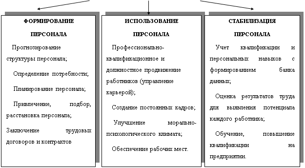 Рис1. Стадии системы управления персоналом Отклонение численности персонала в меньшую или большую сторону влияет на уровень трудового потенциала. Это значит, что как дефицит, так и излишек персонала одинаково отрицательно влияют на трудовой потенциал. Так, нехватка персонала приводит к чрезмерной нагрузке на работников, а содержание излишней численности ведет к недоиспользованию их индивидуального потенциала. Рассматривая процесс управления персоналом как целостную систему, можно выделить основные элементы, реализующие следующие функции: 1. организационную: · планирование источников комплектования кадрами; · информированность населения о наборе кадров и сроках набора; · объем средств, выделенных на подготовку кадров и жилищно-бытовое строительство, и др.; 2. социально-экономическую: · комплекс условий и факторов, определяющих использование и закрепление персонала; 3. воспроизводственную: · обеспечивающую создание учебно-материальной базы и развитие персонала. Структура управления персоналом включает в себя следующие направления деятельности: Ø планирование ресурсов – разработка плана удовлетворения потребностей в людских ресурсах и необходимых для этого затрат; Ø набор персонала – создание резерва потенциальных кандидатов по всем должностям; Ø отбор – привлечение наиболее подходящих кандидатов на рабочие места и отбор лучших из резерва, созданного в ходе набора; Ø определение заработной платы и компенсации – разработка структуры заработной платы и льгот в целях привлечения, найма и сохранения персонала; Ø профориентация – комплекс мероприятий, направленных на оказание помощи человеку в освоении своей профессии и ознакомление с перспективами трудовой деятельности; Ø социальная адаптация – взаимное приспособление работника и организации, для его врабатываемости в новых условиях; Ø обучение – разработка программ обучения персонала в целях эффективного выполнения работы и его продвижения; Ø оценка трудовой деятельности – разработка методик оценки трудовой деятельности и доведение ее до работника; Ø повышение, понижение, перевод, увольнение – разработка методов перемещения работников на должности с большей или с меньшей ответственностью, развития их профессионального опыта путем перемещения на другие должности или участки работы, а также процедур прекращения договора найма; Ø подготовка руководящих кадров, управление продвижением по службе –разработка программ, направленных на развитие способностей и повышение эффективности труда руководящих кадров; Ø занятость – разработка программ обеспечения равных возможностей занятости. Глава 2. Работа с персоналом. Конфликты и пути их разрешения Работа с персоналом – одна из основных обязанностей руководителей всех направлений, которые должны придерживаться определенных правил:Ø ориентация на требования законодательства о труде; Ø учет текущих и перспективных потребностей организации в персонале, исходящих из задач ее развития; Ø соблюдение баланса интересов организации и ее работников; Ø создание условий для сокращения числа увольнений и сохранения занятости; Ø максимальная забота о каждом человеке, уважение его прав, свобод, достоинств. Руководить людьми легче тому, кто способен поставить себя на место другого человека и понять мотивы его п