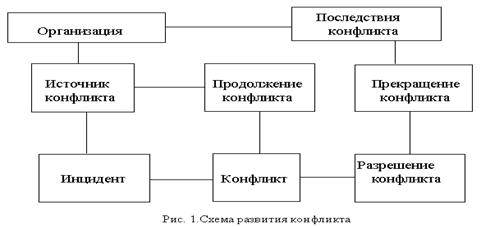 Рис. 1. Схема стадий конфликта. Предконфликтная стадия. Начинается с конфликтной ситуации, которая выявляет оппонентов и причинную обусловленность конфликта. Но это еще не конфликт, а только равновесное состояние, обстоятельство, которое может предшествовать противоборству. Инцидент – вторая фаза предконфликтной стадии. Конфликтная стадия. Чтобы произошло превращение ситуации в конфликт, требуется повод, нужны какие-то действия, приводящие стороны в движение. Только вместе, конфликтная ситуация и инцидент образуют конфликт. Конфликтная ситуация (чаще в скрытой форме) может сохраняться, не приводя к инциденту и не переходя в конфликт. Первая фаза – наступает после инцидента. Происходит неизбежный обмен ударами, назначение которых – наступление на позиции оппонентов, нейтрализация угрозы с их стороны. Очень часто сопровождается нарастанием агрессивности. Эта фаза способствует «переоценке ценностей» с учетом происшедших перемен. Вторая фаза – выбор путей дальнейшего взаимодействия оппонентов. Существует два пути: либо искать примирения; либо эскалация, подолжение конфликта. Послеконфликтная стадия. Ослабление противостояния – первая фаза. Она примечательна тем, что конфликт при всей своей остроте может прекратиться, как в итоге изменения объективной ситуации, так и в результате психологической перестройки субъектов, изменения их взглядов и намерений. На этой основе становится возможным полное или частичное разрешение конфликта. Напряженность ситуации спадает, причины, вызвавшие противостояние и обостренную борьбу, сглаживаются или устраняются. Заключительная фаза – подведение итогов, оценка результатов. Последствия конфликта зависят от факторов объективного и субъективного порядков, манеры поведения сторон, методов преодоления расхождений, умелости тех, кто направлял урегулирование конфликта. Последствия конфликта, при любом исходе, оказывают влияние на организацию и ее персонал. Шипилов выделяет два похода к определениям конфликтов: Широкий: столкновение сторон, мнений, сил (такие конфликты возможны и в неживой природе. Суженный: столкновение противоположно направленных целей, интересов, позиций, мнений или взглядов оппонентов или субъектов взаимодействия (люди, группы людей) [21]. При перенесении более узкого определения с межличностных на внутриличностные конфликты автор переходит к рассмотрению особенностей внутриличностных конфликтов, на чем мы и остановимся в следующем параграфе. 1.2 Проблематика понятия «внутриличностный конфликт»Внутриличностный конфликт – выраженное негативное переживание, вызванное затянувшейся борьбой структур внутреннего мира личности, отражающее ее противоречивые связи с социальной средой и задерживающее принятие решения [21]. Б.С. Волков и Н.Д. Волкова дают несколько другое определение: внутриличностный конфликт – конфликт внутри психического мира личности, который представляет собой столкновение ее противоположно направленных мотивов между сознательными и бессознательными влечениями, между требованиями совести и стремлением к получению удовольствия, между инстинктивными позывами и нормами культуры и нравственности [13, 65]. Таким образом, это определение раскрывает формулировку «борьба структур внутреннего мира личности». Б.С. Волков и Н.Д. Волкова говорят 