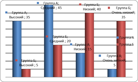 Рис. 1. Результаты методики определения уровня конфликтоустойчивости Математический анализ результатов по t-критерию Стьюдента показал по данной методике значимые статистические различия между группами (таблица 2.). Таблица 2.2 - Статистический анализ результатов методики определения уровня конфликтоустойчивости № Выборки Отклонения от среднего Квадраты отклонений В.1 В.2 В.1 В.2 В.1 В.2 1 25 19 -10.55 -8.55 111.3025 73.1025 2 31 29 -4.55 1.45 20.7025 2.1025 3 42 45 6.45 17.45 41.6025 304.5025 4 32 28 -3.55 0.45 12.6025 0.2025 5 43 19 7.45 -8.55 55.5025 73.1025 6 27 36 -8.55 8.45 73.1025 71.4025 7 33 28 -2.55 0.45 6.5025 0.2025 8 44 36 8.45 8.45 71.4025 71.4025 9 39 29 3.45 1.45 11.9025 2.1025 10 29 19 -6.55 -8.55 42.9025 73.1025 11 35 29 -0.55 1.45 0.3025 2.1025 12 42 28 6.45 0.45 41.6025 0.2025 13 42 19 6.45 -8.55 41.6025 73.1025 14 15 35 -20.55 7.45 422.3025 55.5025 15 35 19 -0.55 -8.55 0.3025 73.1025 16 38 29 2.45 1.45 6.0025 2.1025 17 43 38 7.45 10.45 55.5025 109.2025 18 36 19 0.45 -8.55 0.2025 73.1025 19 43 28 7.45 0.45 55.5025 0.2025 20 37 19 1.45 -8.55 2.1025 73.1025 Суммы:711 551 0 -0 1072.95 1132.95 Среднее:35.55 27.55 Результат: tЭмп = 3.3 Критические значения tКр p≤0.05 p≤0.01 2.02 2.71 Полученное эмпирическое значение t (3.3) находится в зоне значимости. Таким образом, анализ результатов показал, что в двух группах наблюдаются существенные отличия по уровню конфликтоустойчивостиПри диагностике наличия внутриличностного конфликта у сотрудников отделов нами проведен тест Кноблоха-Фальконетта (внутренняя конфликтность личности). Результаты представлены в таблице 3, на рис. 2. и в приложении 2. Табл. 3. Результаты теста Кноблоха-Фальконетта (средний балл)
